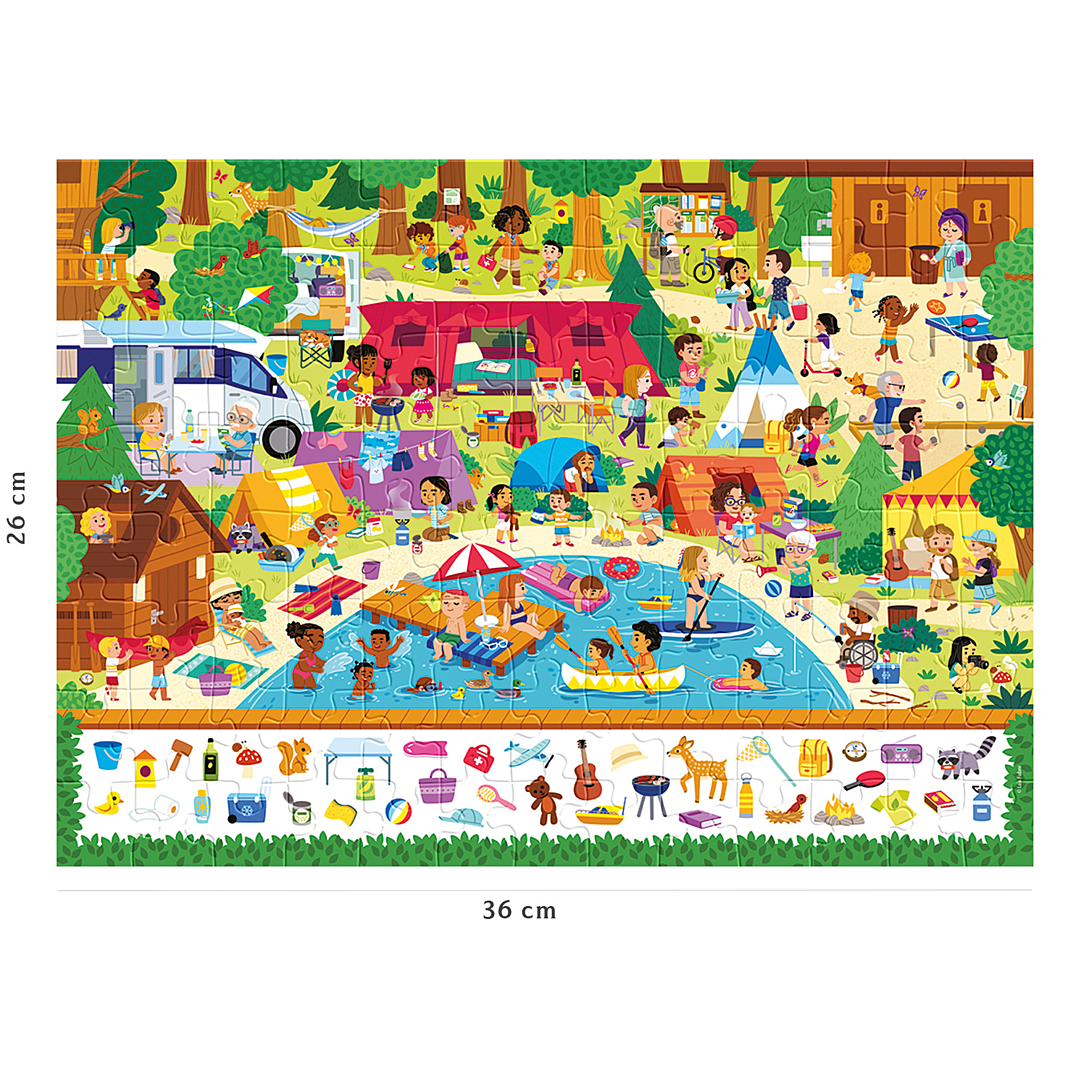 | Plus produit | CHERCHE ET TROUVE : Grâce aux puzzles Cherche et Trouve, votre enfant pourra s\'amuser plus longtemps à identifier les objets à trouver. Bien plus qu\'un simple puzzle,les jolies illustrations colorées et pleines de détails permettent à l\'enfant de plonger pleinement dans un univers et d\'y découvrir de nombreux objets.Idéal pour les enfants dès 6 an AU CAMPING : Oulala il y a vraiment beaucoup de monde dans ce camping, un vrai casse tête. Repérez les éléments à retrouver sur le bas de l\'illustration : avez-vous vu les jumelles et la bouée ? Et qui porte l\'appareil photo ? Une activité amusante qui développe le sens de l\'observation et le vocabulaire de l\'enfant. CONTENU : 1 puzzle de 100 pièces, avec trieur de pièces inclus. Dimensions du puzzle : 36 x 26 cm. Une qualité de fabrication impeccable : matériau extra-épais et durable résistant aux nombreuses manipulations pour permettre de s\'amuser encore plus longtemps avec son puzzle ! ENVIRONNEMENT : Fabriqué en Europe, ce puzzle est composé de matériaux issus de forêts bien gérées certifiées FSC, de matériaux recyclés et de matériaux issus dautres sources contrôlées (FSC-C111262). Une qualité de fabrication impeccable : matériau extra-épais et durable résistant aux nombreuses manipulations pour s\'amuser encore plus longtemps! UN CADEAU IDEAL pour les enfants dès 6 ans. Les enfants seront ravis de recevoir ce puzzle pour Noël, un anniversaire ou juste pour le plaisir. Il permettra à l\'enfant de s\'initier de manière autonome au puzzle et/ou de permettre aux parents de partager un moment de convivialité et de détente avec leur enfant. |