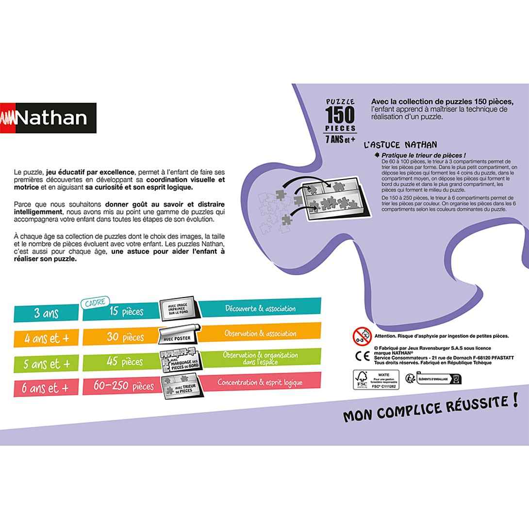 Un puzzle de 150 pièces, avec un trieur de pièces à 3 compartiments, idéalement conçu pour les enfants dès 7 ans.