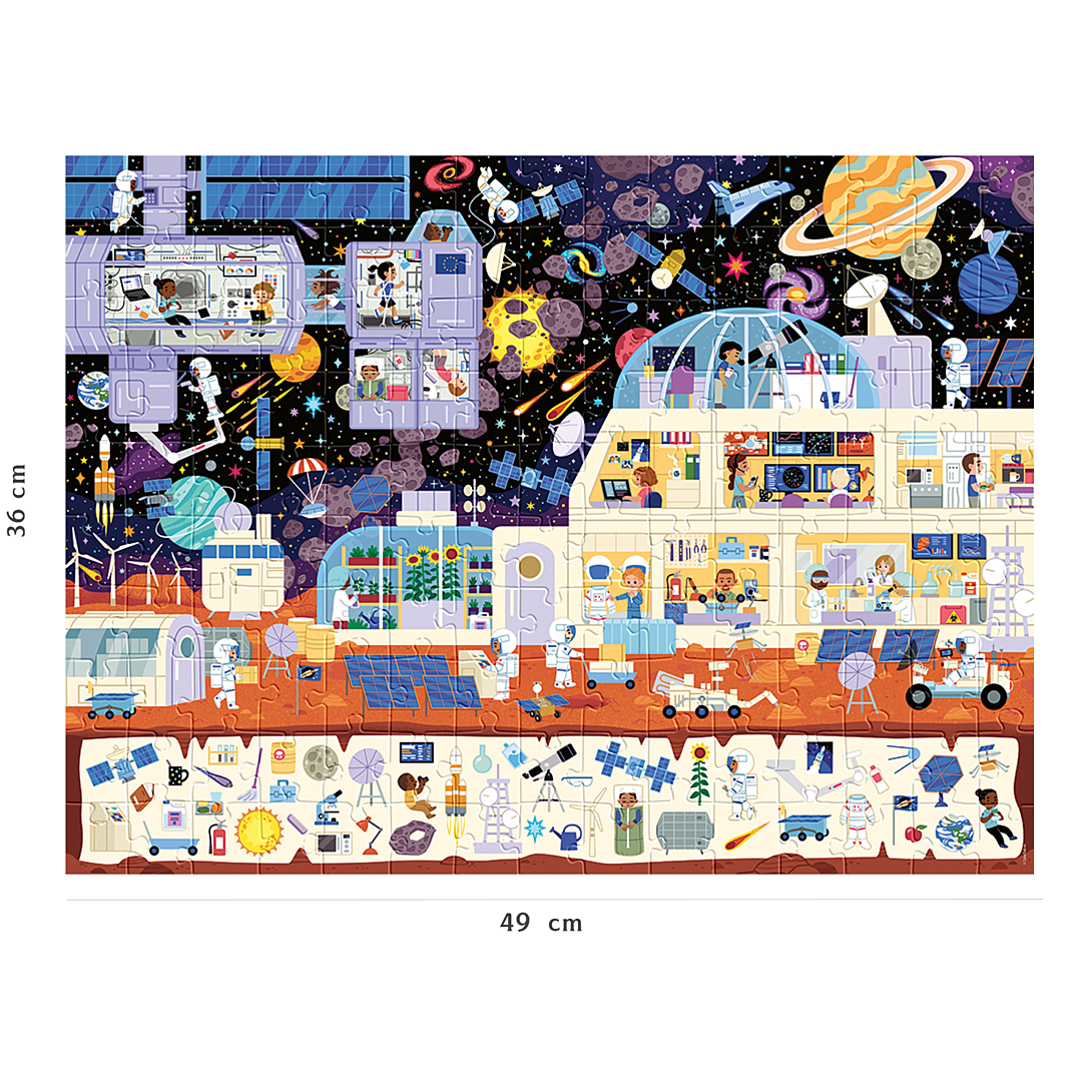 | Plus produit | CHERCHE ET TROUVE : Grâce aux puzzles Cherche et Trouve, votre enfant pourra s\'amuser plus longtemps à identifier les objets à trouver. Bien plus qu\'un simple puzzle,les jolies illustrations colorées et pleines de détails permettent à l\'enfant de plonger pleinement dans un univers et d\'y découvrir de nombreux objets. Idéal pour les enfants dès 7 a DANS L\'ESPACE : Oulala il y a vraiment beaucoup d\'activités dans cette base spatiale, un vrai casse tête. Repérez les éléments à retrouver sur le bas de l\'illustration : avez-vous vu le tournevis ? Et qui porte la tenue d\'astronaute ? Une activité amusante qui développe le sens de l\'observation et le vocabulaire de l\'enfant. CONTENU : 1 puzzle de 150 pièces, avec trieur de pièces inclus. Dimensions du puzzle : 49 x 36 cm. Une qualité de fabrication impeccable : matériau extra-épais et durable résistant aux nombreuses manipulations pour permettre de s\'amuser encore plus longtemps avec son puzzle ! ENVIRONNEMENT : Fabriqué en Europe, ce puzzle est composé de matériaux issus de forêts bien gérées certifiées FSC, de matériaux recyclés et de matériaux issus dautres sources contrôlées (FSC-C111262). De plus, nos puzzles sont garantis 2 ans à compter de la date d\'achat ! UN CADEAU IDEAL pour les enfants dès 7 ans. Les enfants seront ravis de recevoir ce puzzle pour Noël, un anniversaire ou juste pour le plaisir. Il permettra à l\'enfant de s\'initier de manière autonome au puzzle et/ou de permettre aux parents de partager un moment de convivialité et de détente avec leur enfant. |