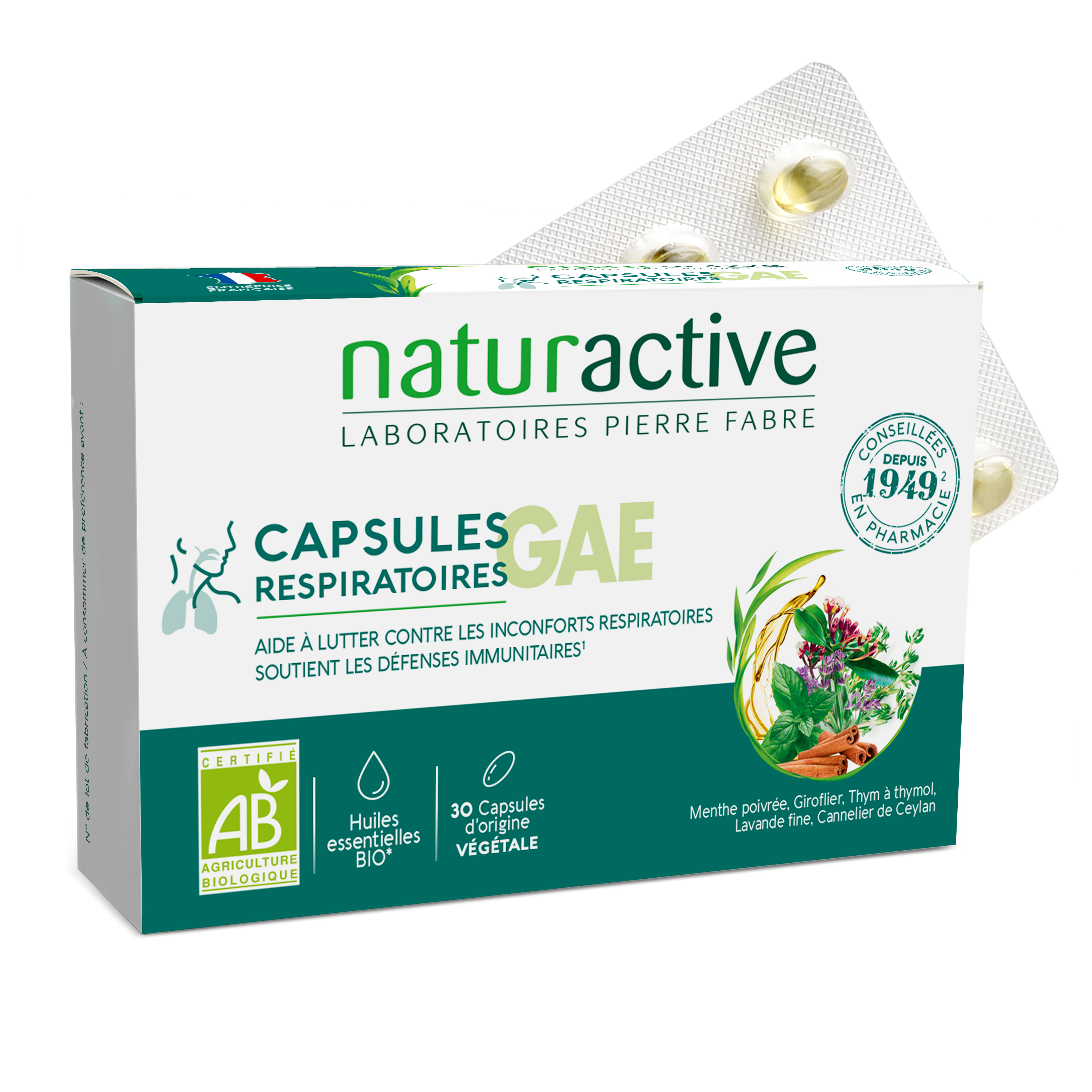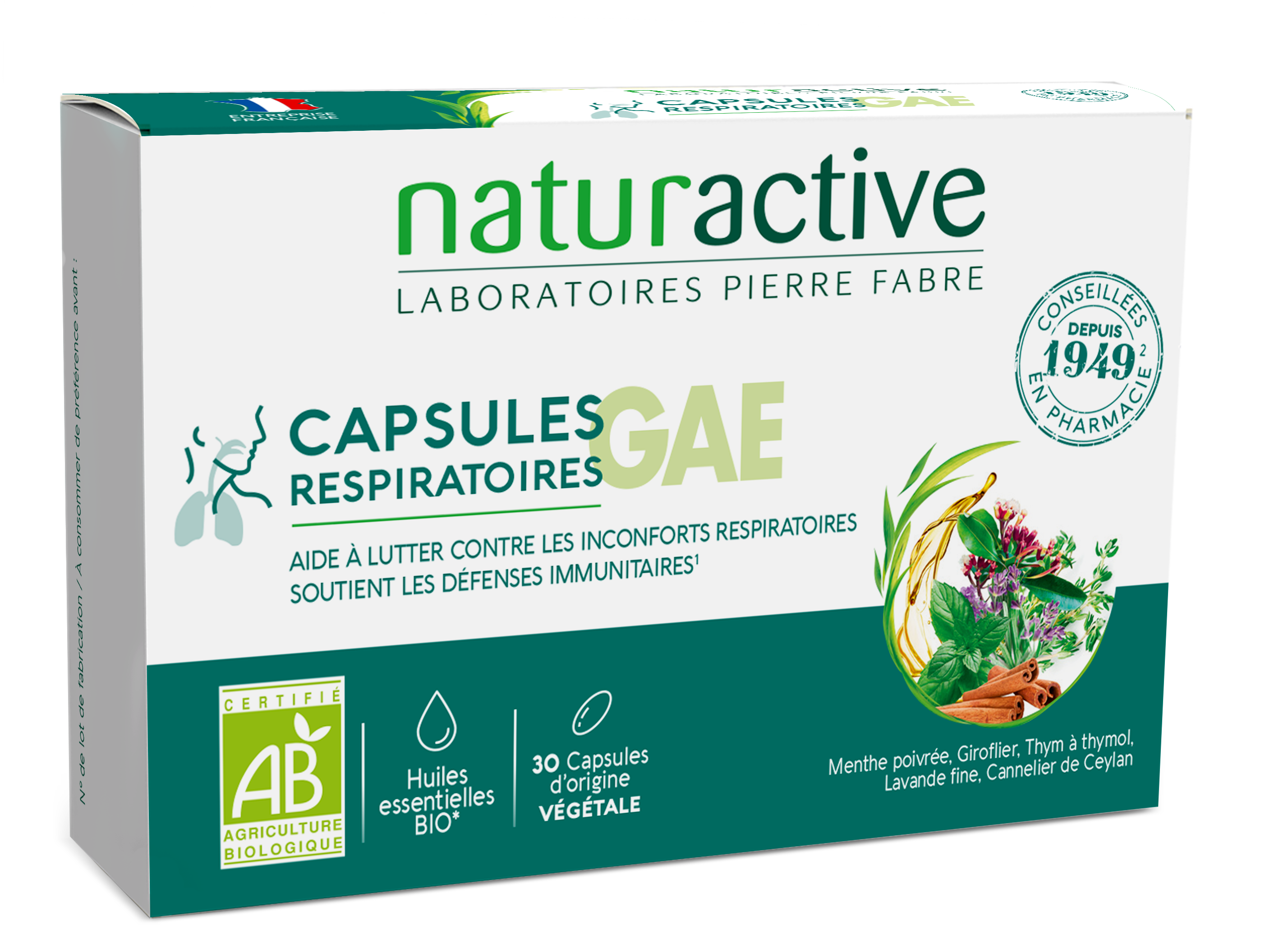 Les Capsules Respiratoires Naturactive contiennent le complexe GAE, un mélange de 5 huiles essentielles BIO dont la Menthe poivrée et le Thym à thymol qui aident à lutter contre les inconforts respiratoires et soutiennent les défenses immunitaires.