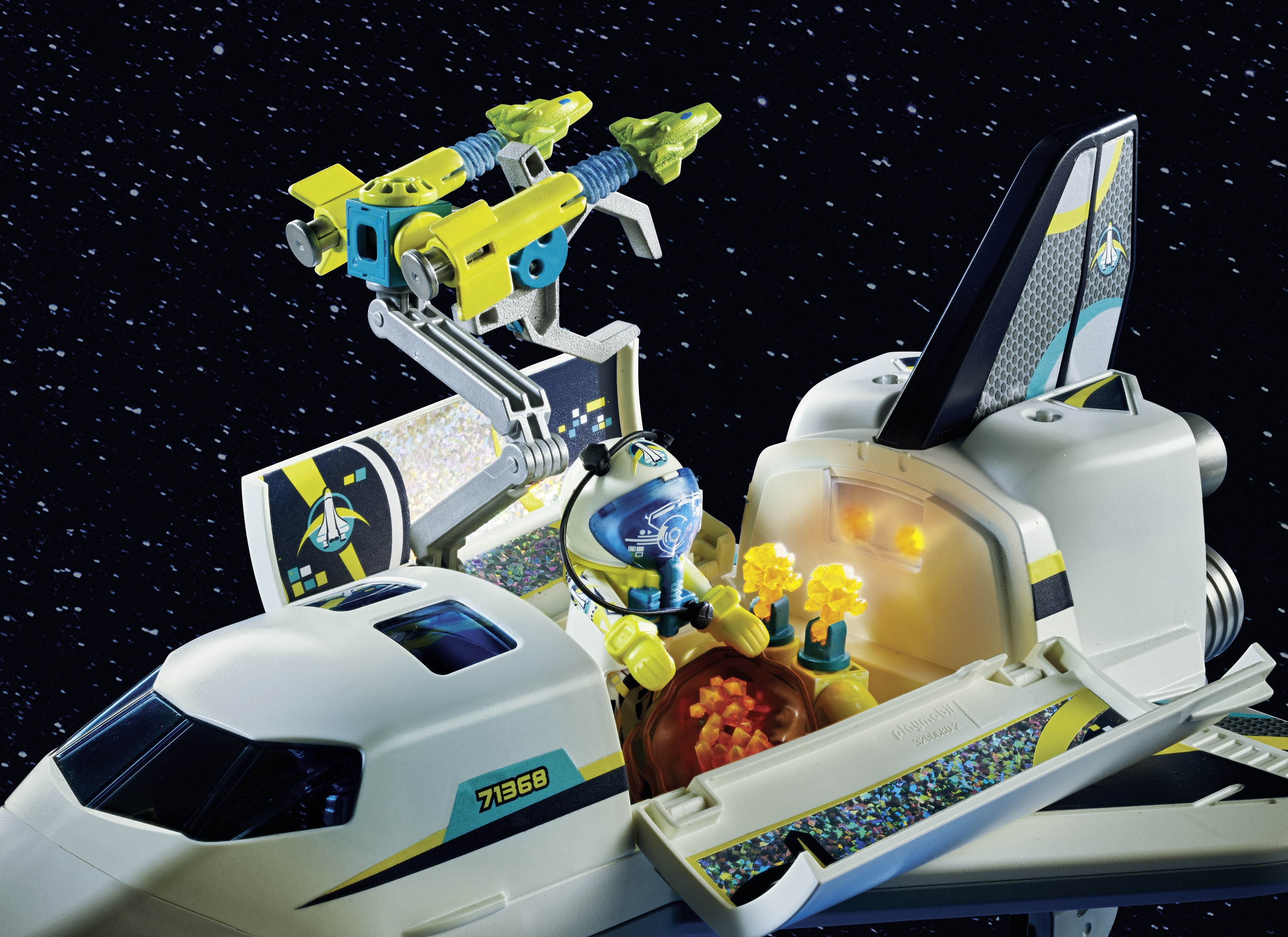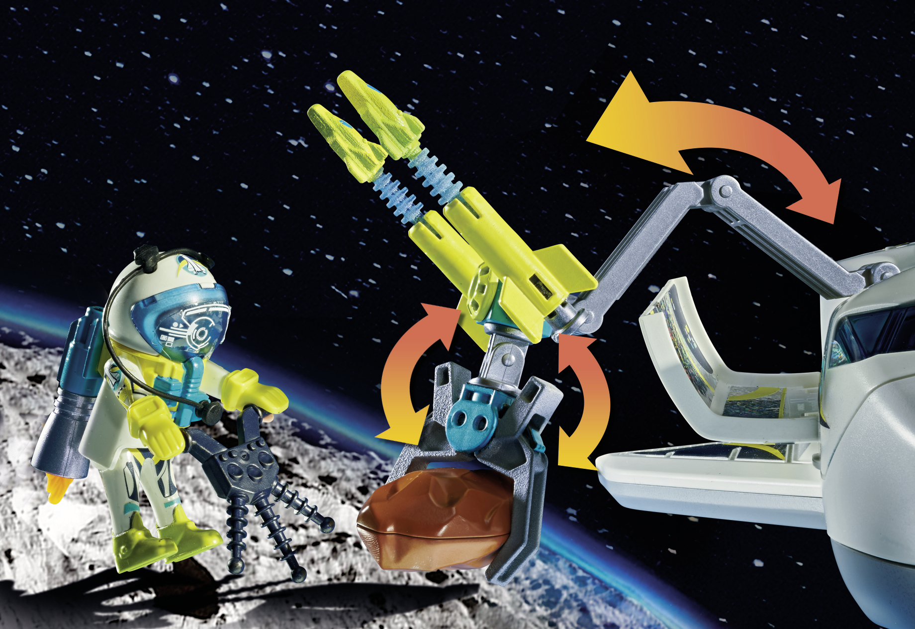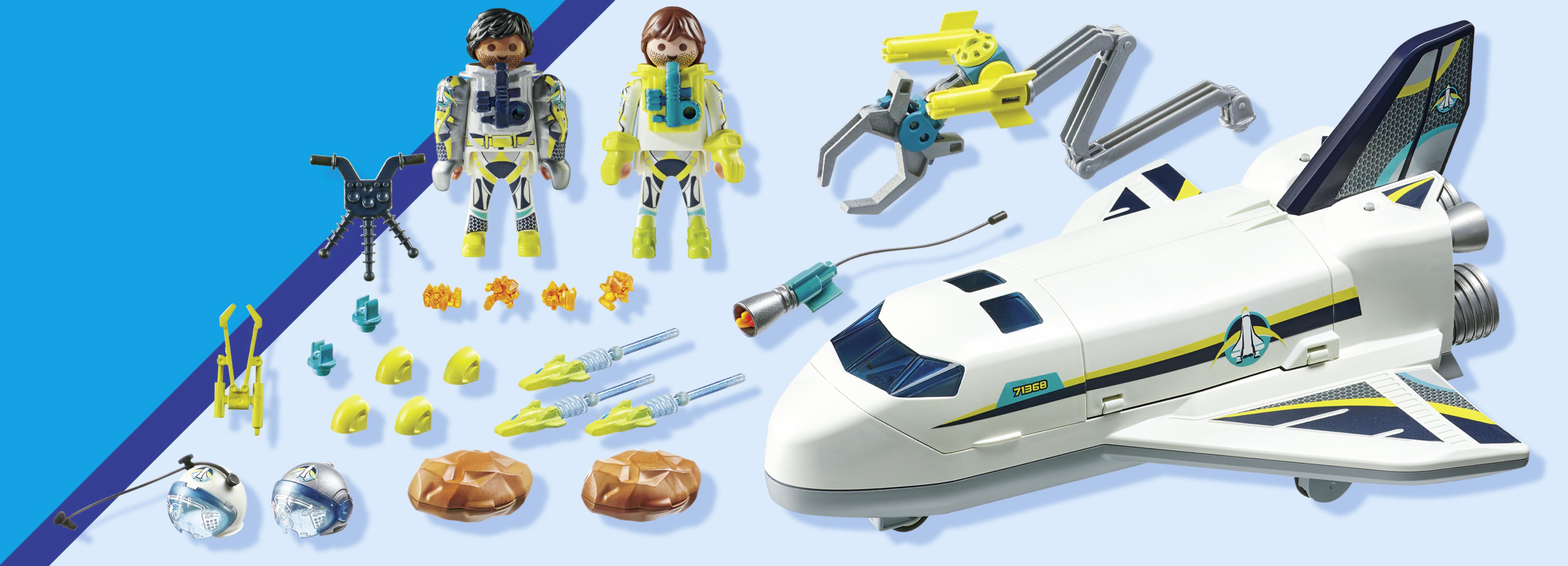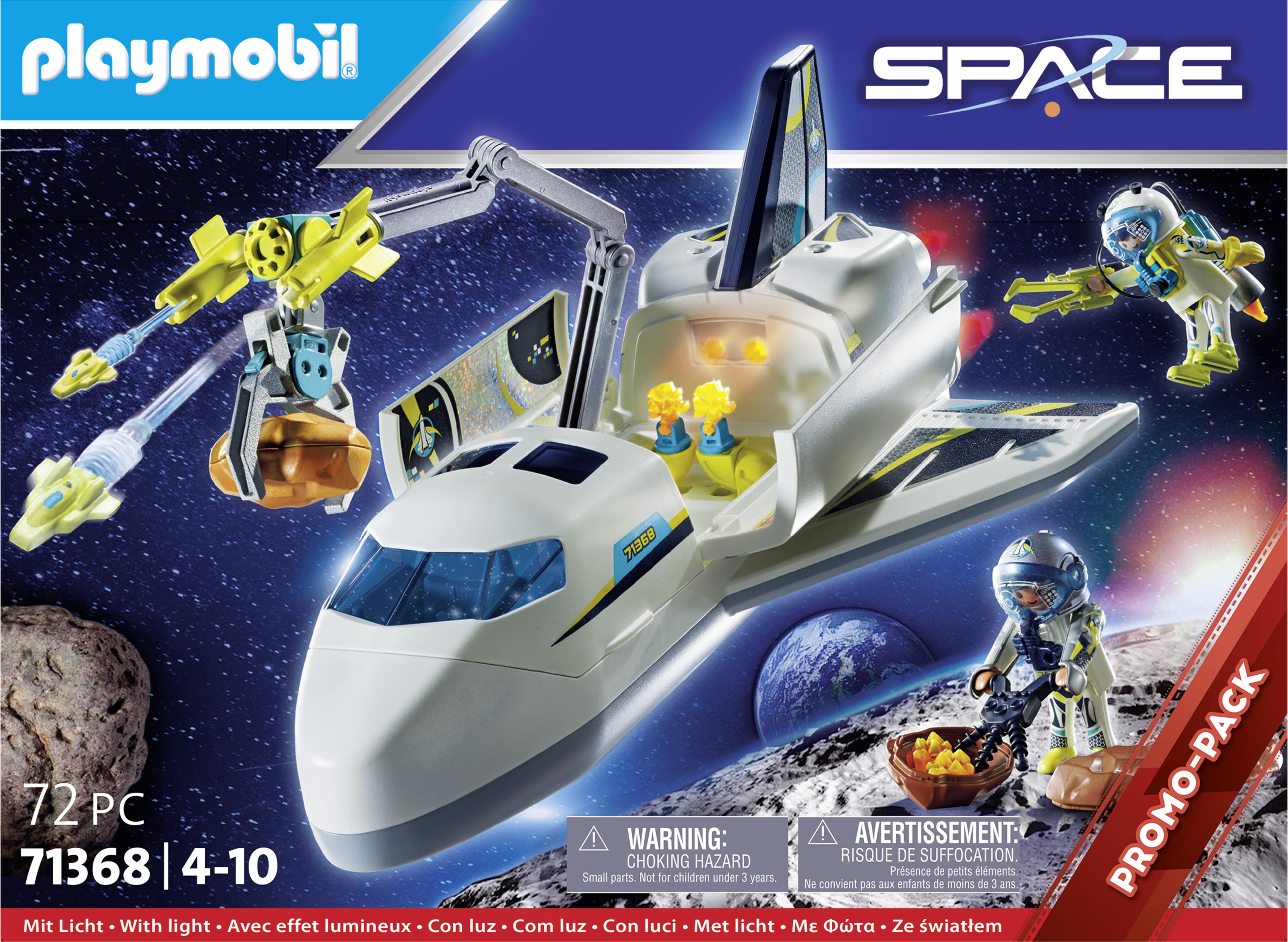 | Plus produit | Comprend deux personnages dans leurs tenues de cosmonautes\nComporte une navette spatiale avec effets lumineux (nécessite 3 piles AAA 1,5V)\nLa navette spatiale peut envoyer des projectiles et est équipée dune grande pince lui permettant de récupérer des météorites\nLes météorites peuvent souvrir et contenir des éclats oranges \nUn personnage peut sinstaller à lavant de la navette spatiale pour la piloter |