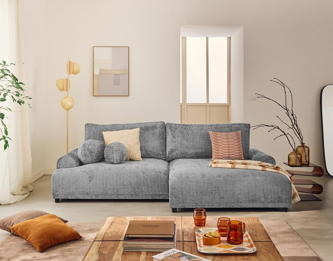 | Libellé | Nelly - canapé d'angle droit 4 places convertible avec coffre en velours texturé |