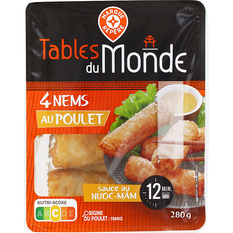 Nems poulet (60 g par pièce) : eau ; vermicelle de pois réhydraté ; farine de riz 15,4 % ; viande de poulet 12 % ; carotte ; protéine de soja texturée réhydratée ; oignon ; champignon noir réhydraté ; sauce soja (eau, graines de soja, sel, farine de blé) ; chapelure (farine de blé, sel) ; sel ; farine de perles de tapioca ; oignon déshydraté. Huile de friture : huile de tournesol. Pourcentages exprimés sur le nem avant friture.