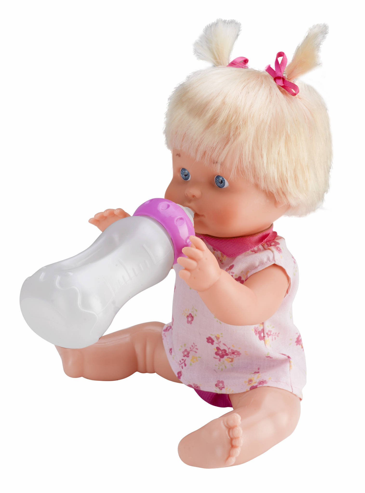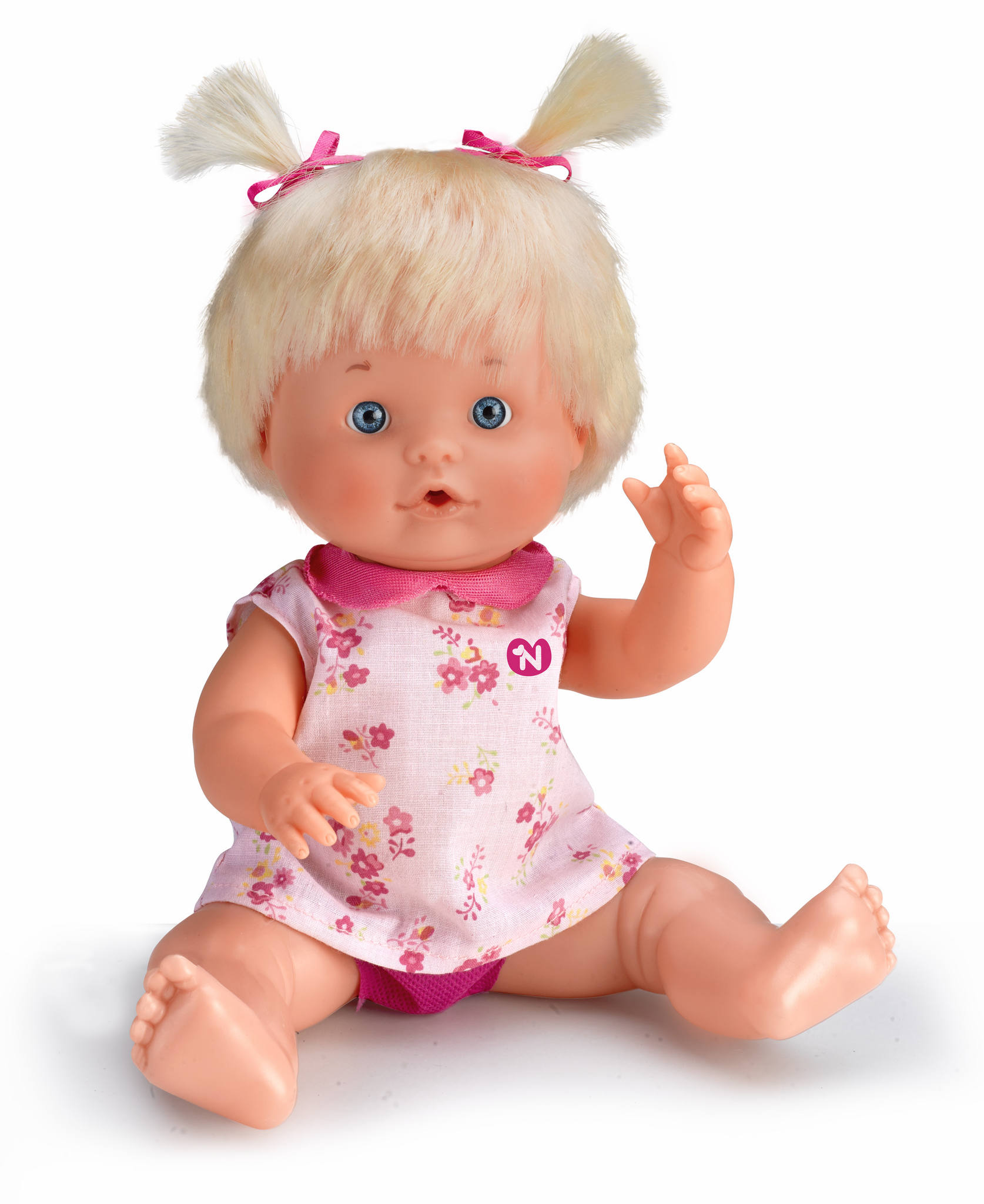 Poupon Nenuco de 30cm au corps rigide qui boit et fait pipi. Un biberon et un pot inclus.
