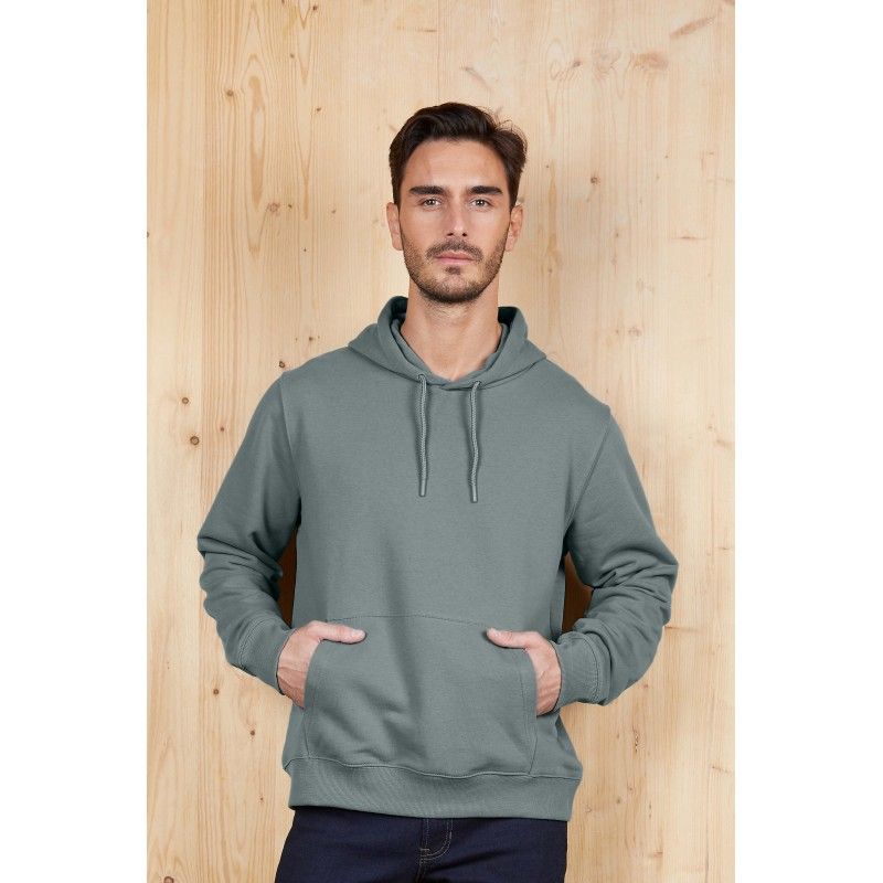 Poche kangourou Capuche avec cordon de serrage et doublure jersey Poignets et bas en bord côte 2x2 Demi-lune à l'intérieur du col Bande de propreté intérieur col Oeillets et embouts tons sur tons