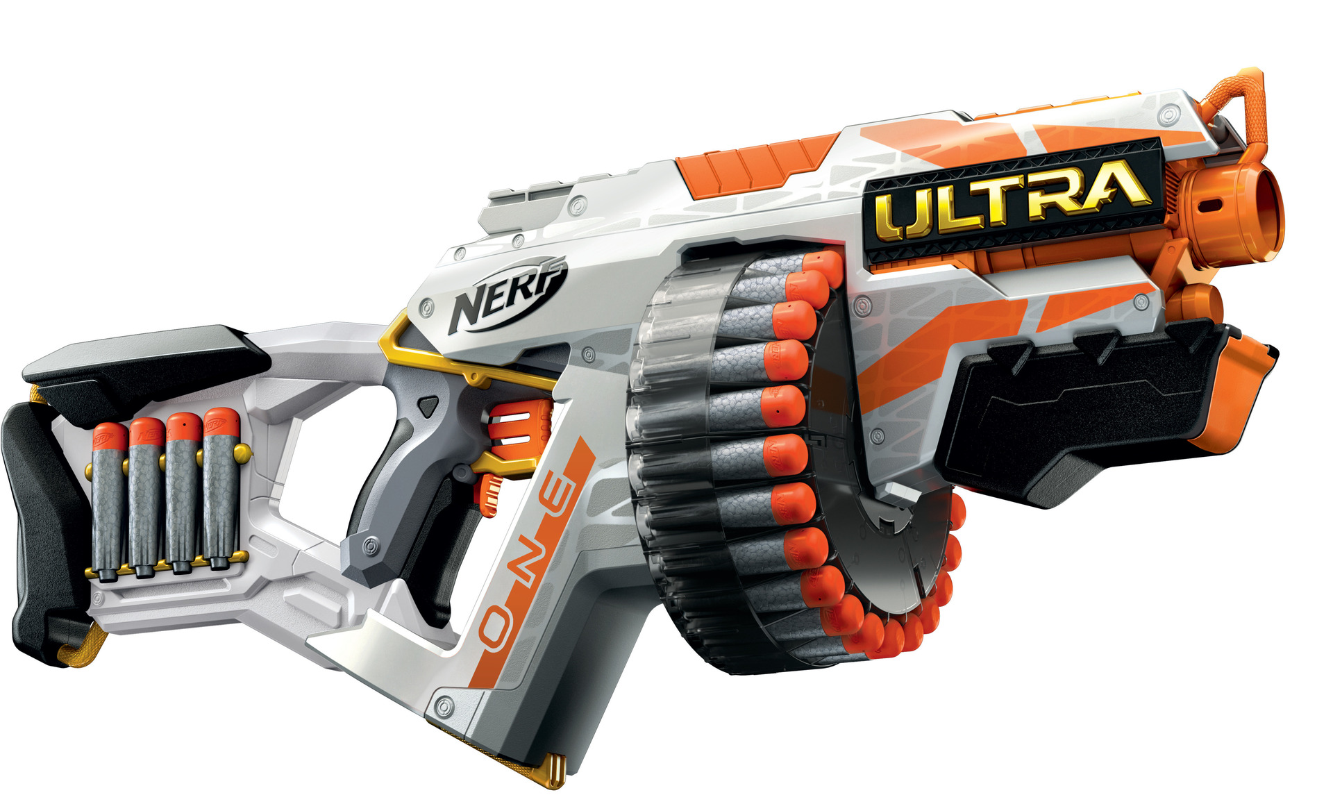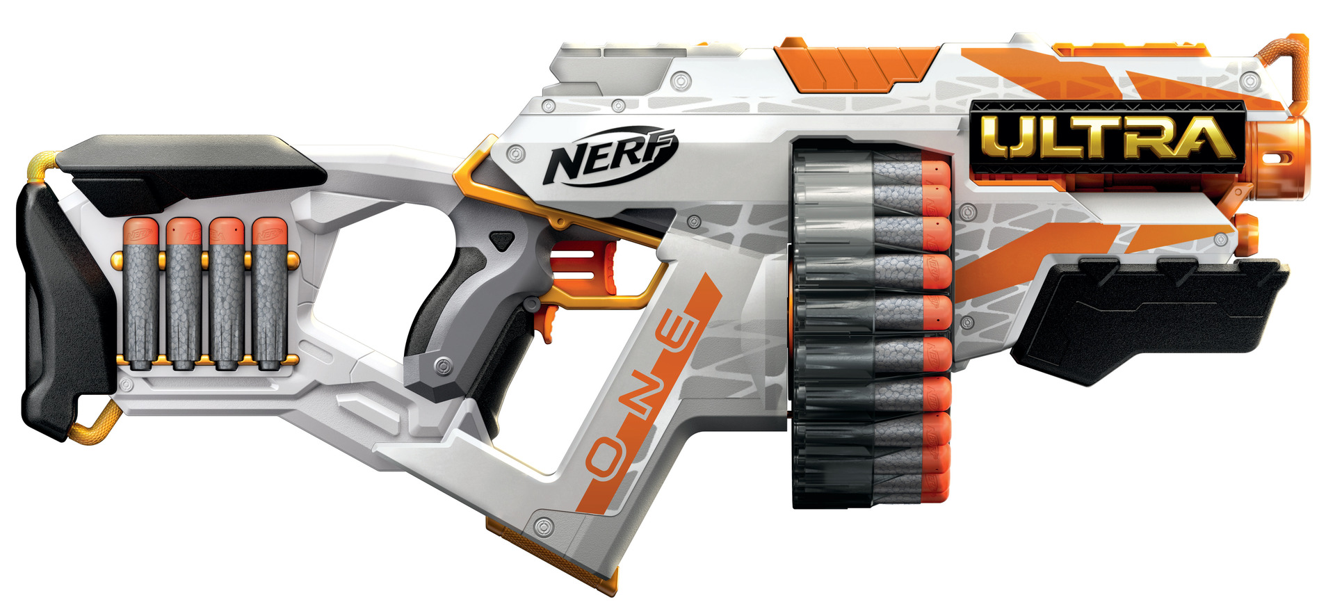 Le Nec plus Ultra des Blaster ! Le tir motorisé permet de tirer encore plus vite et son barillet rotatif peut contenir jusqu'à 25 fléchettes Ultra incluses. Le Blaster Ultra One permet de tirer encore plus loin jusqu'à 36 m et avec précision grâce à ses fléchèttes à ailettes.