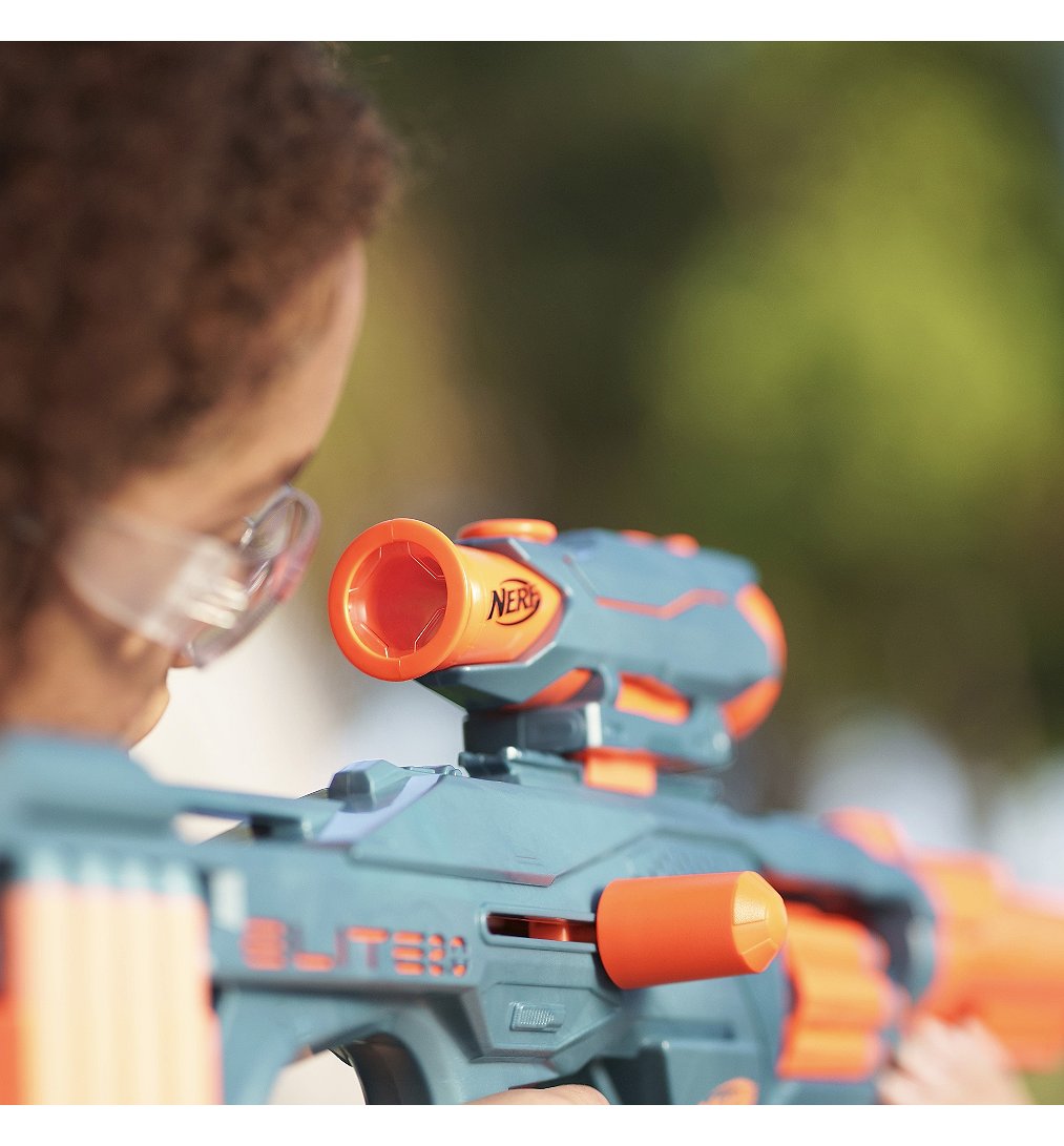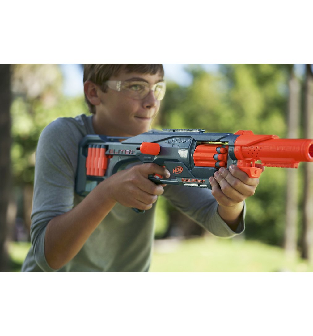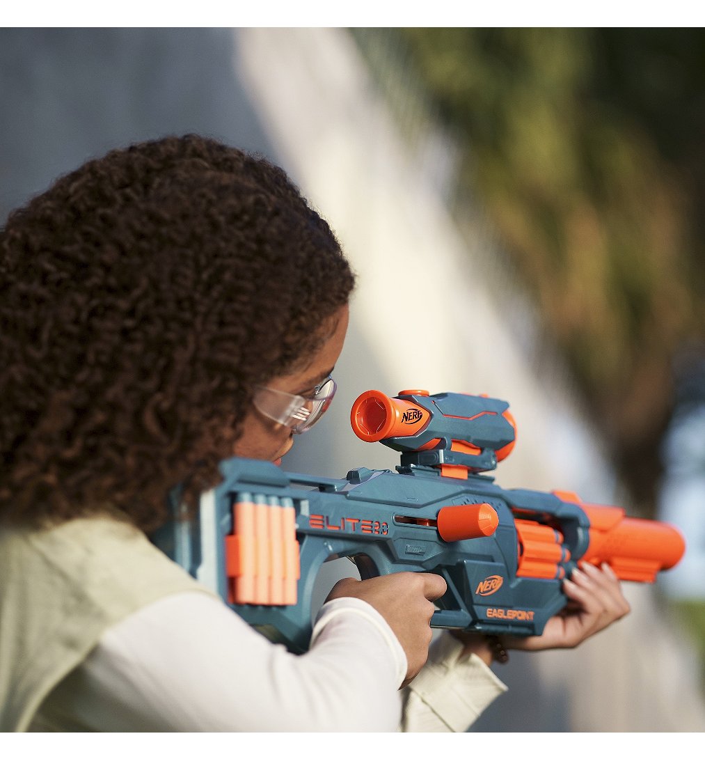 On peut personnaliser le blaster Nerf Elite 2.0 Eaglepoint RD-8 selon la mission ! Ce blaster à fléchettes Nerf inclut un viseur et un canon amovibles permettant de créer des styles de blaster différents pour chaque compétition Nerf.