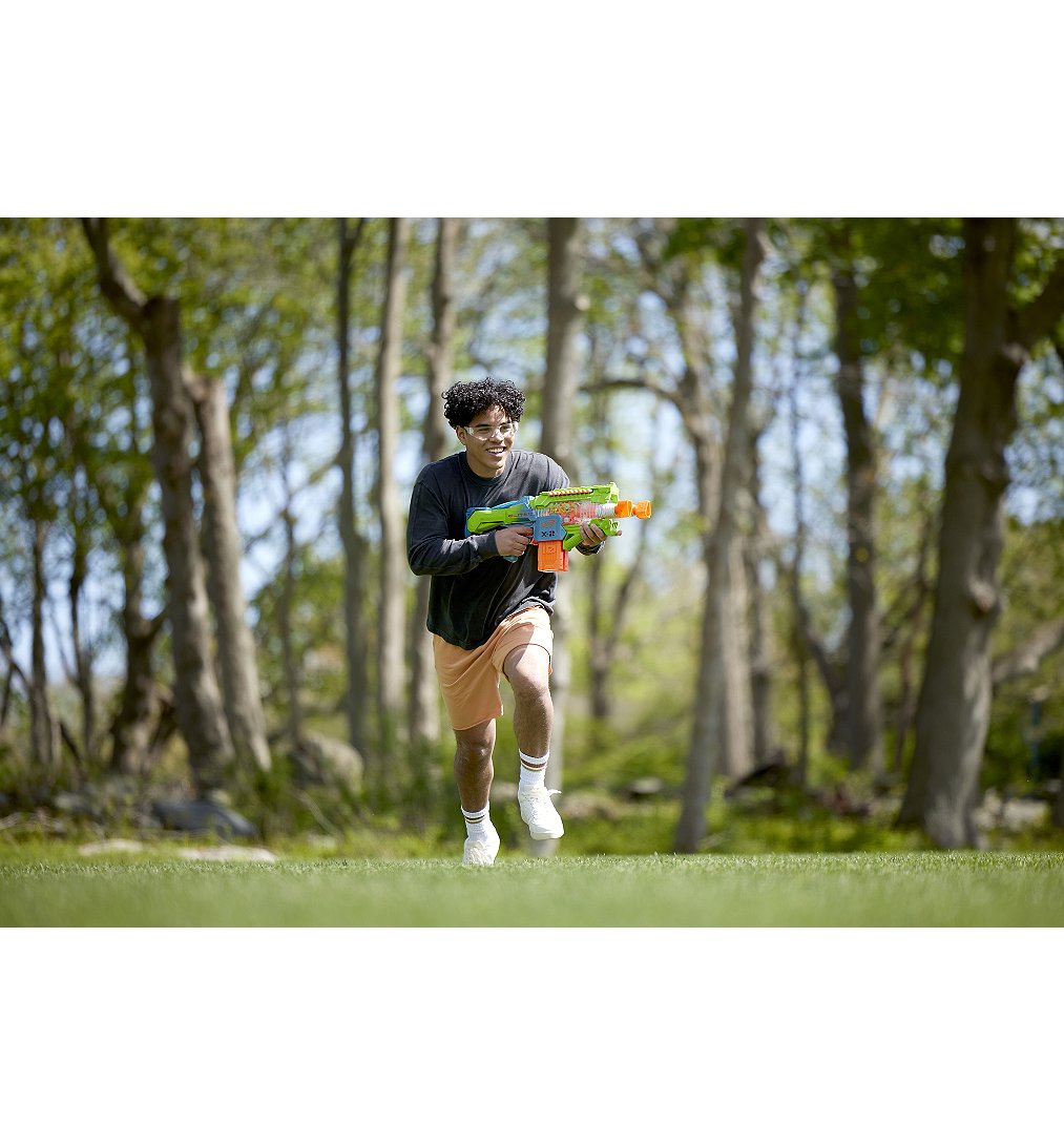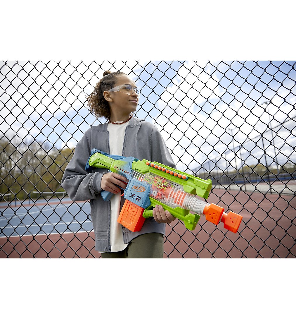 On peut s'amuser deux fois plus grâce au blaster Double Punch Nerf Elite 2.0 avec deux canons et deux chargeurs ! Le blaster à fléchettes Double Punch a 2 canons alternatifs qui se déplacent d'avant en arrière rapidement quand on tire Ce blaster Nerf automatique inclut 2 chargeurs d'une capacité de 10 fléchettes chacun permettant de tirer 20 fléchettes de suite. Le blaster inclut 50 fléchettes en mousse Nerf Elite 2.0, ce qui permet de remplir les deux chargeurs deux fois et de garder des fléchettes en réserve. Ce blaster Nerf motorisé a des canons alternatifs qui se déplacent d'avant en arrière quand on s'amuse à tirer des fléchettes en mousse. Avec ses caractéristiques et son style amusants, le blaster Double Punch est un super cadeau pour les enfants. Les blasters Nerf électriques sont parmi les meilleurs jouets d'intérieur et d'extérieur pour inciter filles et garçons à dépenser leur énergie en jouant activement. Lunettes recommandées (non incluses). Requiert 4 piles alcalines AA de 1,5 V (non incluses) Nerf et toutes les marques associées sont des marques de commerce de Hasbro.