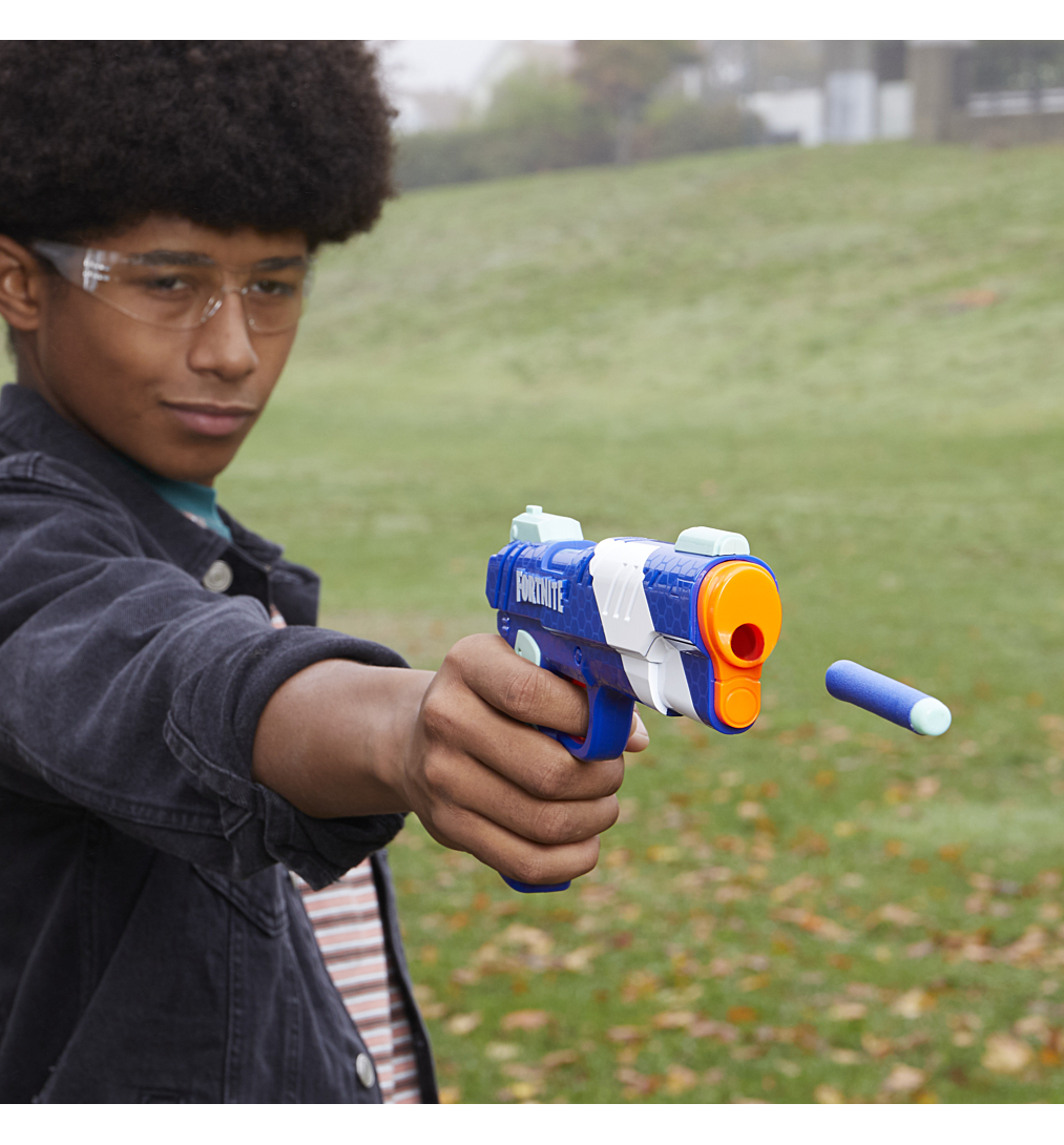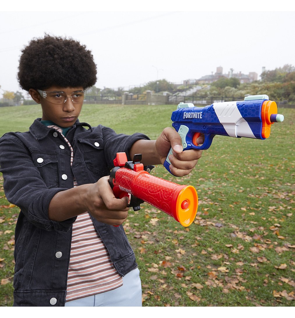 | Plus produit | 2 BLASTERS NERF FORTNITE : Ce super pack inclut 2 blasters à fléchettes Nerf Fortnite et 6 fléchettes en mousse Nerf Elite ! Tout ce qu\'il faut pour commencer à jouer à l\'extérieur INSPIRÉ DE L\'ÉQUIPEMENT FORTNITE : Inclut 2 blasters Nerf Fortnite inspirés de l\'équipement utilisé dans Fortnite. Les deux blasters sont proposés pour la première fois dans ce multipack INCLUT 6 FLÉCHETTES NERF ELITE : Ce pack de 2 blasters Nerf Fortnite est idéal pour jouer à lextérieur et inclut 6 fléchettes Nerf Elite pour les recharges BLASTER FLINT-KNOCK : Le blaster Flint-Knock a un système d\'amorçage par percuteur et tire 1 fléchette. Facile à utiliser, il suffit d\'insérer une fléchette par l\'avant du canon, d\'abaisser le percuteur et d\'appuyer sur la détente BLASTER LP : Le blaster LP a une glissière d\'amorçage et tire 1 fléchette. Prêt à l\'action en 3 étapes faciles, il suffit d\'insérer la fléchette par l\'avant du canon, de ramener la glissière vers l\'arrière et d\'appuyer sur la détente |