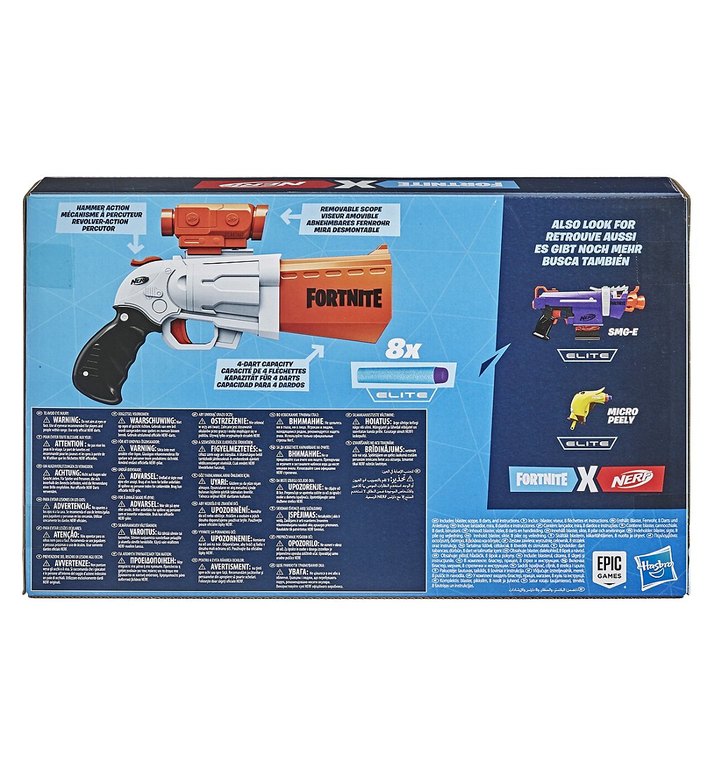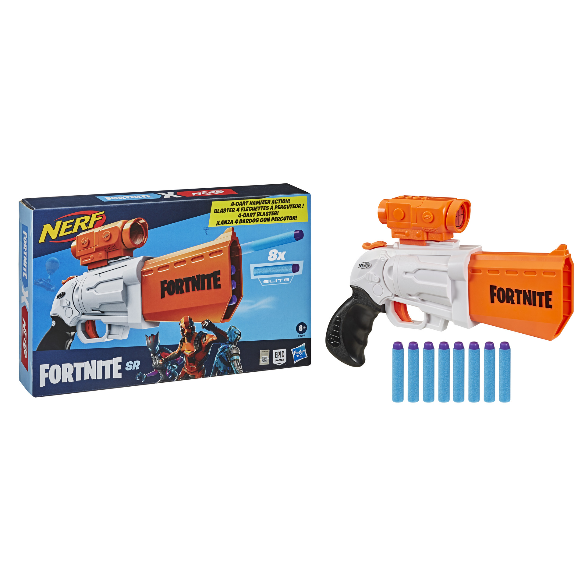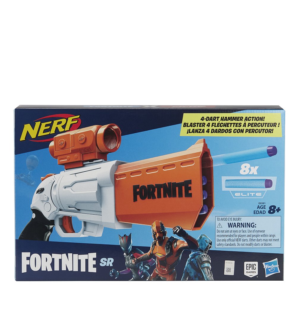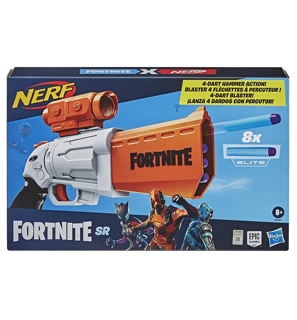 | Plus produit | BLASTER LANCE-FLÉCHETTES RÉPLIQUE DU BLASTER DE FORTNITE : Ce blaster Nerf Fortnite SR est inspiré du blaster employé dans le jeu vidéo Fortnite, recréant son design et ses couleurs CAPACITÉ DE 4 FLÉCHETTES ET MÉCANISME À PERCUTEUR : Ce blaster Nerf Fortnite se charge à l\'aide d\'un percuteur. On insère 4 fléchettes dans le blaster, on recule le percuteur pour actionner, puis on appuie sur la détente pour tirer une fléchette. VISEUR AMOVIBLE : Inclut un viseur amovible qu\'on peut installer ou enlever à volonté pour aider à tirer de façon plus précise. On peut jouer à Fortnite dans le monde réel grâce au blaster à fléchette Nerf Fortnite SR INCLUT 8 FLÉCHETTES NERF ELITE : Inclut 8 fléchettes Nerf Elite officielles testées et approuvées pour la performance et la qualité |