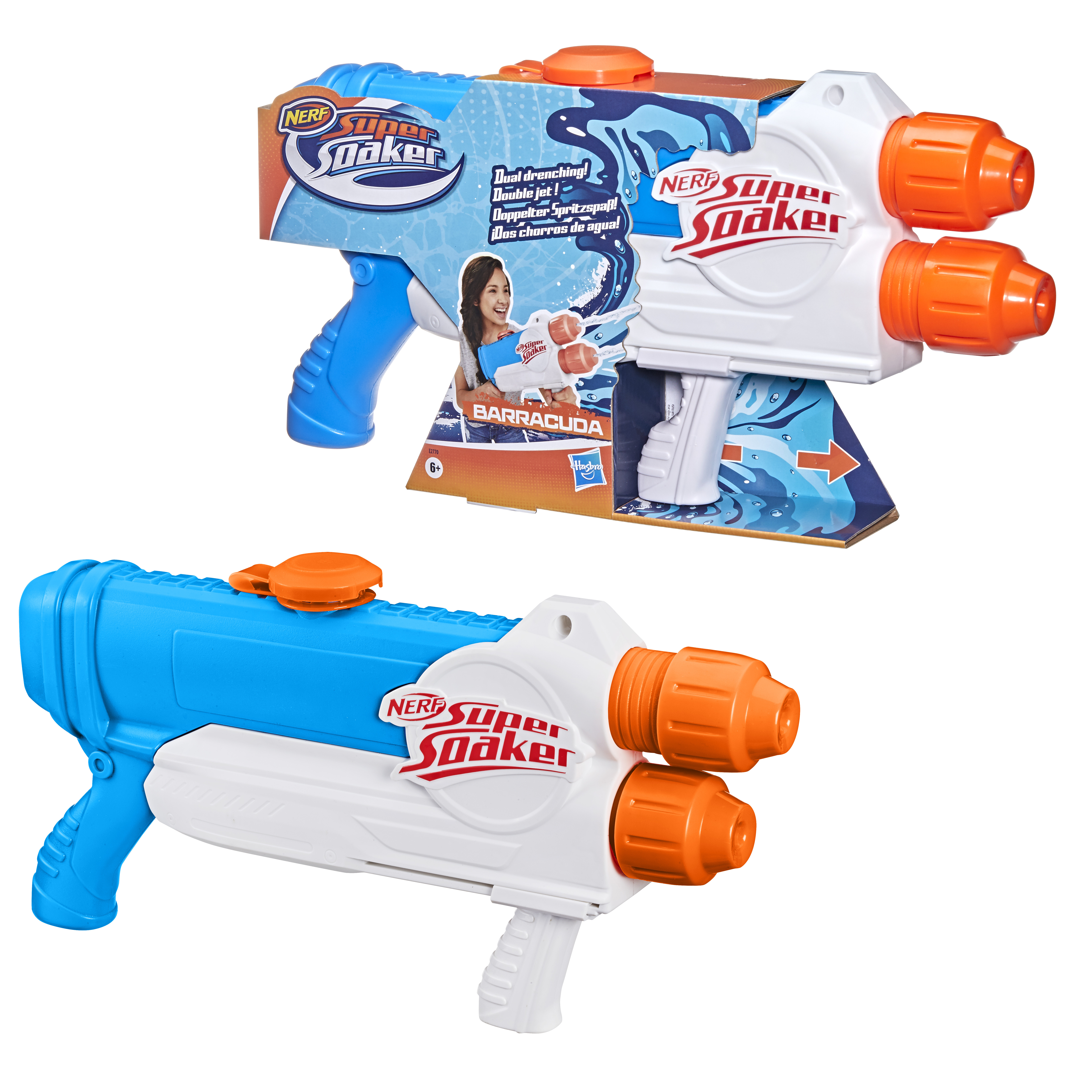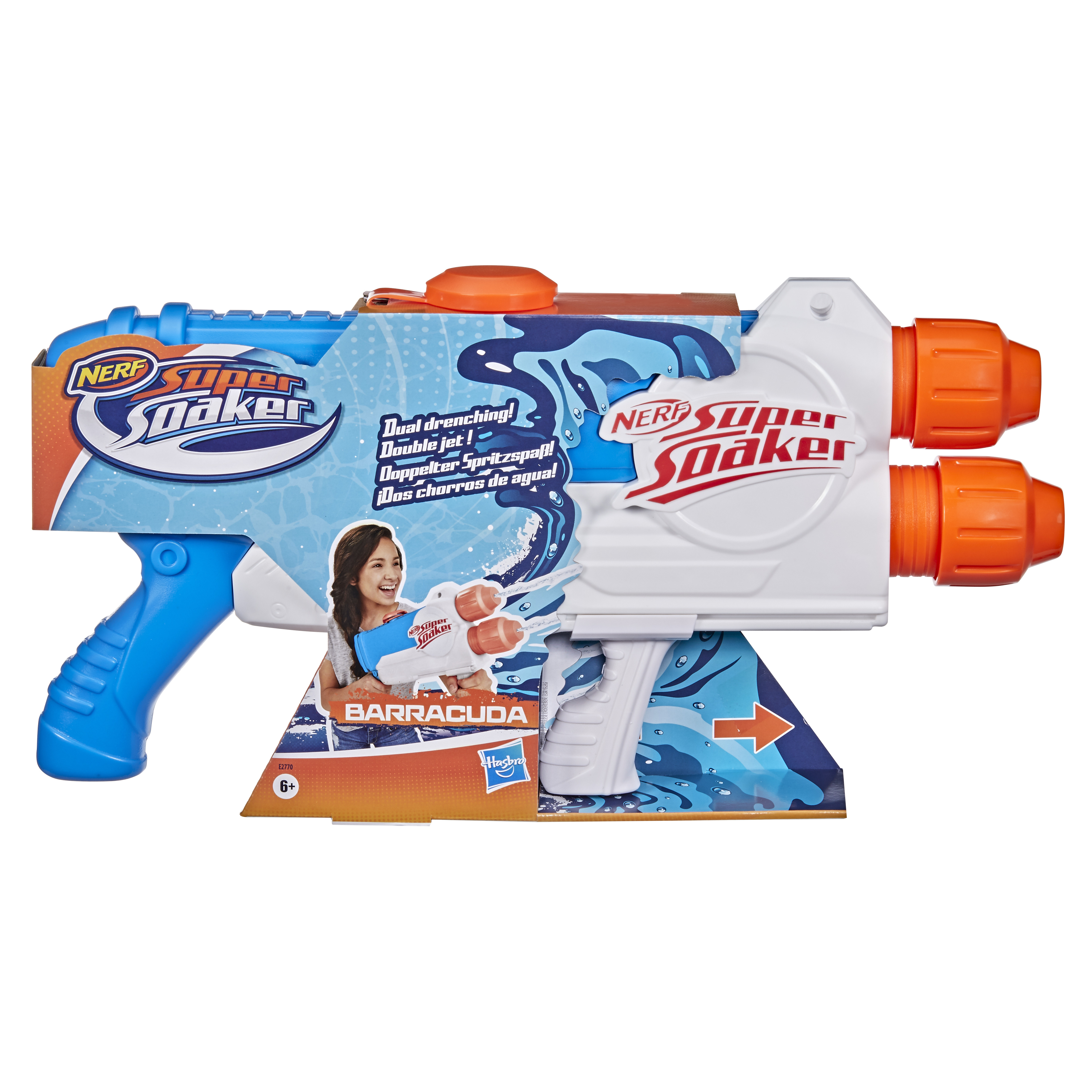 On peut inonder ses adversaires avec un arrosage double du blaster à eau Barracuda de Super Soaker. Il comporte deux canons superposés à la verticale. Il suffit de d'actionner la poignée d'avant en arrière pour tirer 2 jets d'eau continus. Ce blaster à eau bleu et blanc peut contenir jusqu'à 1 L. Grâce au blaster à eau Barracuda, les amateurs de Super Soaker pourront tremper deau leurs adversaires ! © Larami Ltd. Nerf Super Soaker et toutes les marques associées sont des marques de commerce de Hasbro.