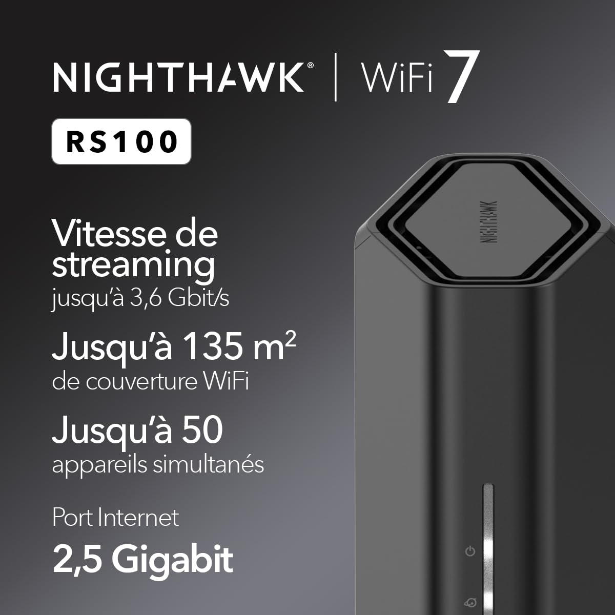 NETGEAR Nighthawk . Type de connexion WAN: RJ-45. Bande Wi-Fi: Bi-bande (2,4 GHz / 5 GHz), Norme Wi-Fi: Wi-Fi 7 (802.11be), Débit de transfert des données WLAN (max): 3600 Mbit/s. Type d'interface LAN Ethernet: 2.5 Gigabit Ethernet, LAN Ethernet : taux de transfert des données: 10,100,1000,2500 Mbit/s. Algorithme de sécurité soutenu: 128-bit AES, WPA, WPA2, WPA3. Type de produit: Routeur, Couleur du produit: Noir