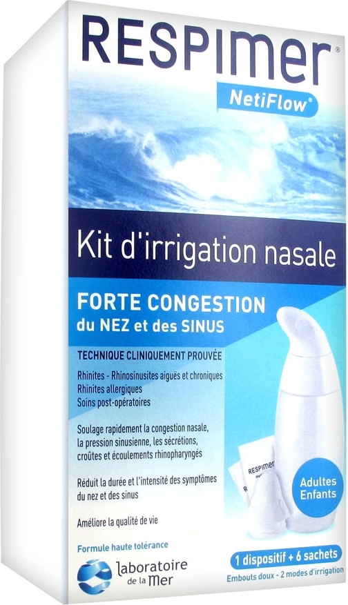 RESPIMER NetiFlow est un dispositif d’irrigation nasale qui consiste à irriguer les cavités rhino-sinusiennes de manière abondante et continue en vue de nettoyer les muqueuses de l’appareil respiratoire. RESPIMER NetiFlow procure un soulagement durable des symptômes du nez et des sinus, et une amélioration significative de la qualité de vie. RESPIMER NETIFLOW EST RECOMMANDÉ EN CAS DE : Rhinosinusite chronique (allergique ou non allergique) Rhinite allergique Forte congestion Soin post-opératoire RESPIMER NETIFLOW SOULAGE LES SYMPTÔMES DU NEZ ET DES SINUS Soulage les douleurs sinusiennes Réduit la congestion nasale Élimine les sécrétions après chirurgie nasale Adultes et enfants de plus de 4 ans. Convient à la femme enceinte et allaitante.