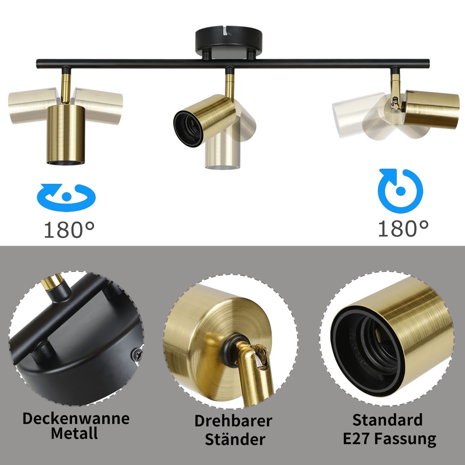 | Libellé | NETTLIFE 3 Spots de plafond vintage E27 lampe industrielle noir et or rétro pivotant moderne pour cuisine couloir salle à manger |