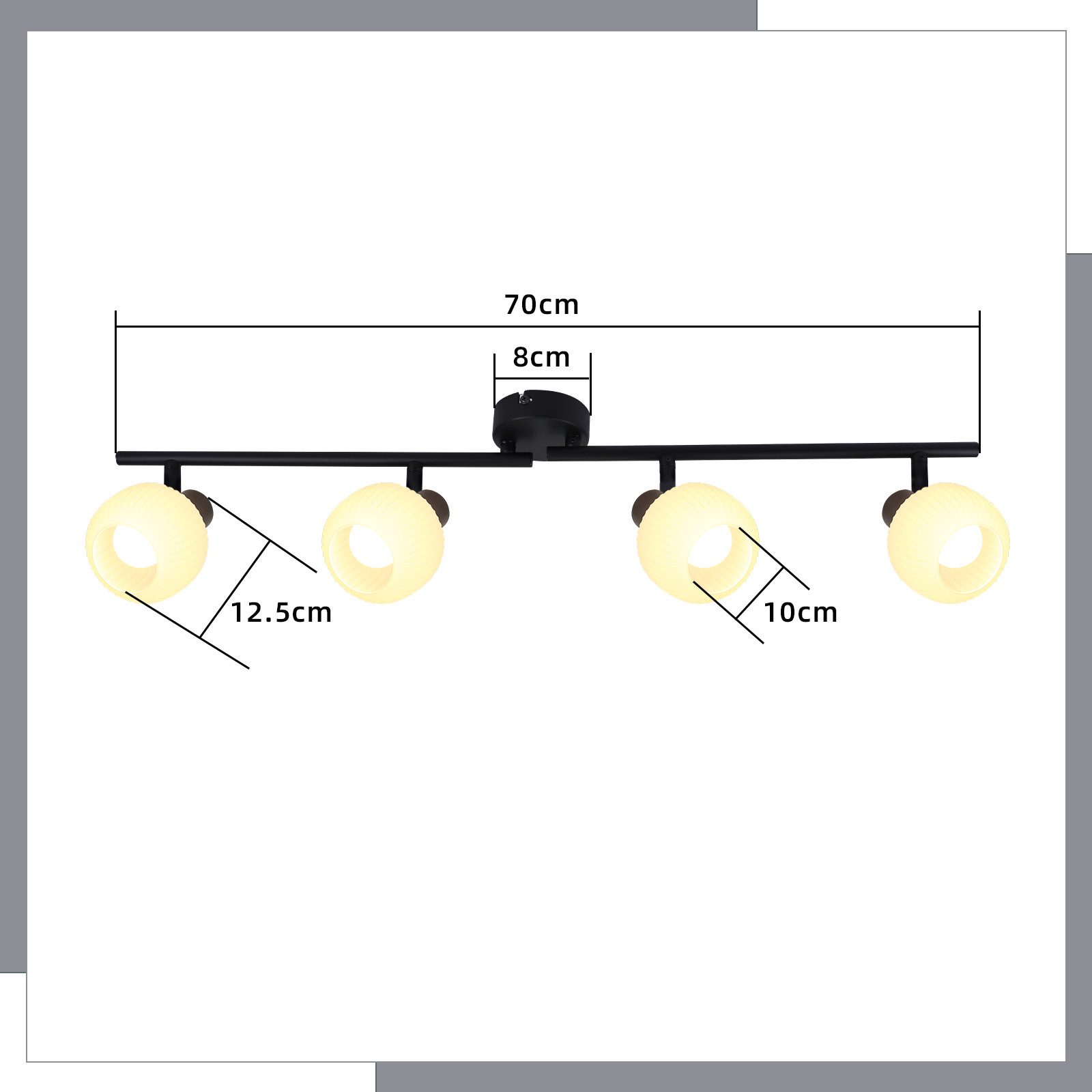 [Détails techniques] Taille du corps de la lampe : 70*10*17,5 cm ; Source de lumière : E14*4 (source de lumière non incluse) ; Puissance : max. 25 W ; Tension : 220-240 VAC ; Matériau : fer + verre ; Angle de pivotement : haut et bas 90°, 350° gauche et droite, rotation 330° de la tige principale