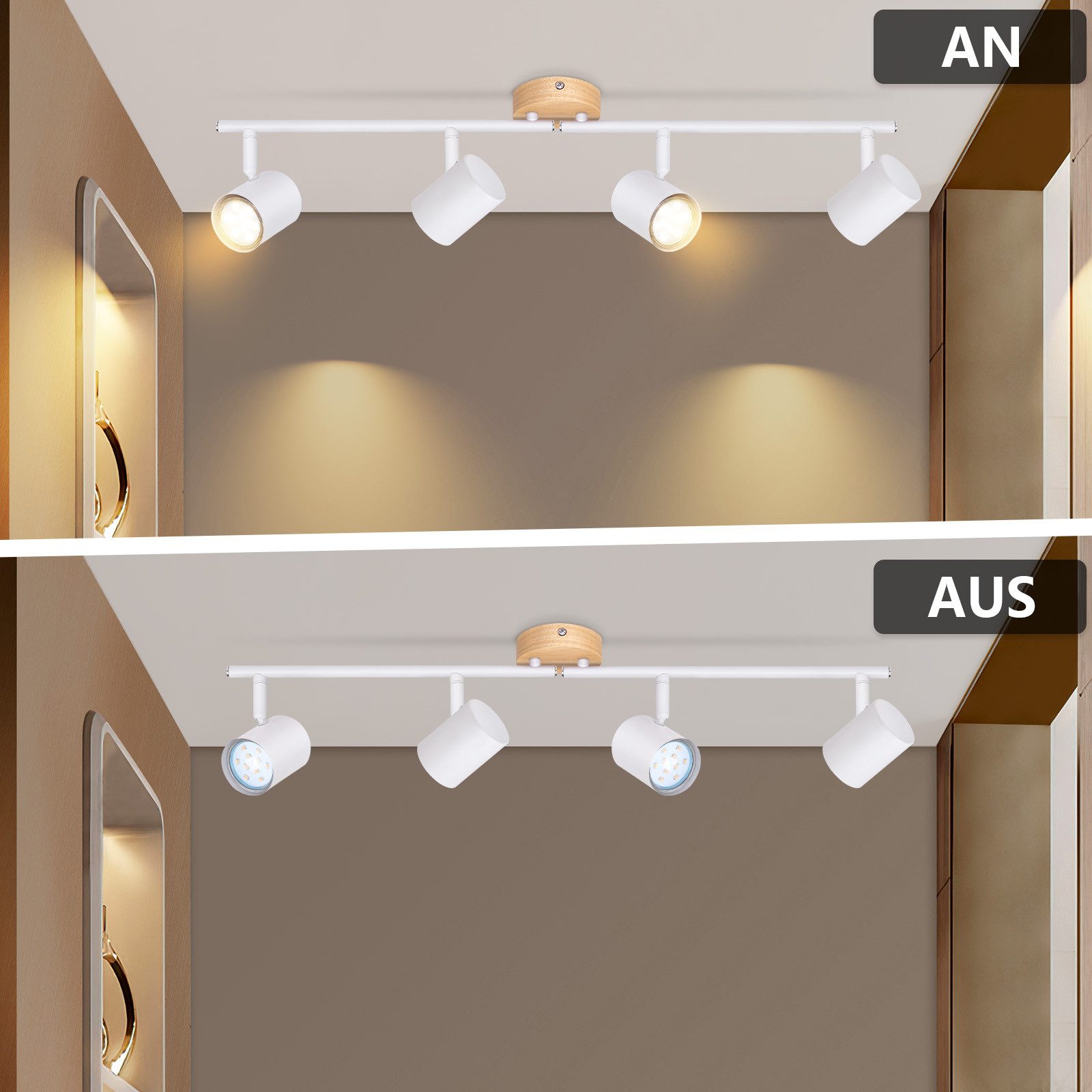 NETTLIFE Plafonnier LED 4 flamme - Blanc Plafonnier GU10 Spot pivotant Applique murale en bois Spot mural