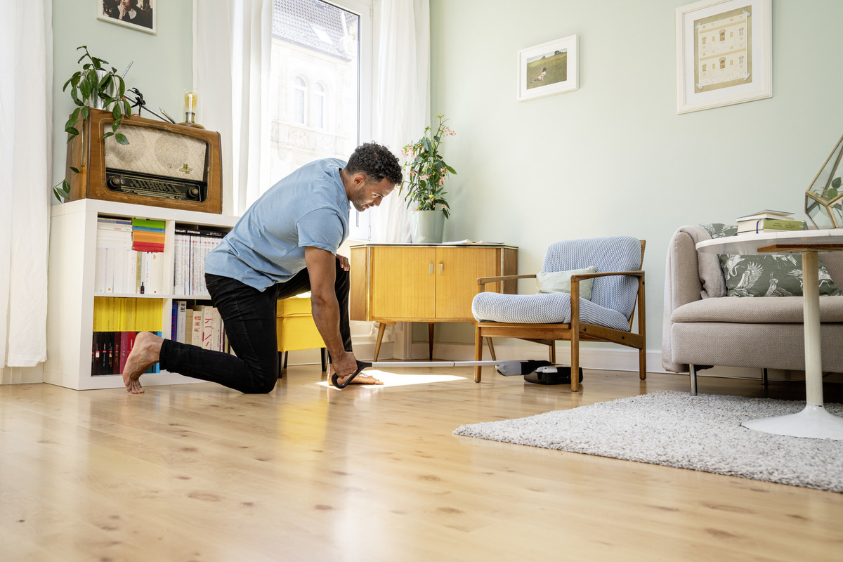 Le résultat n’est pas satisfaisant : traces d’eau sur le carrelage et rouleau qui " accroche " au sol