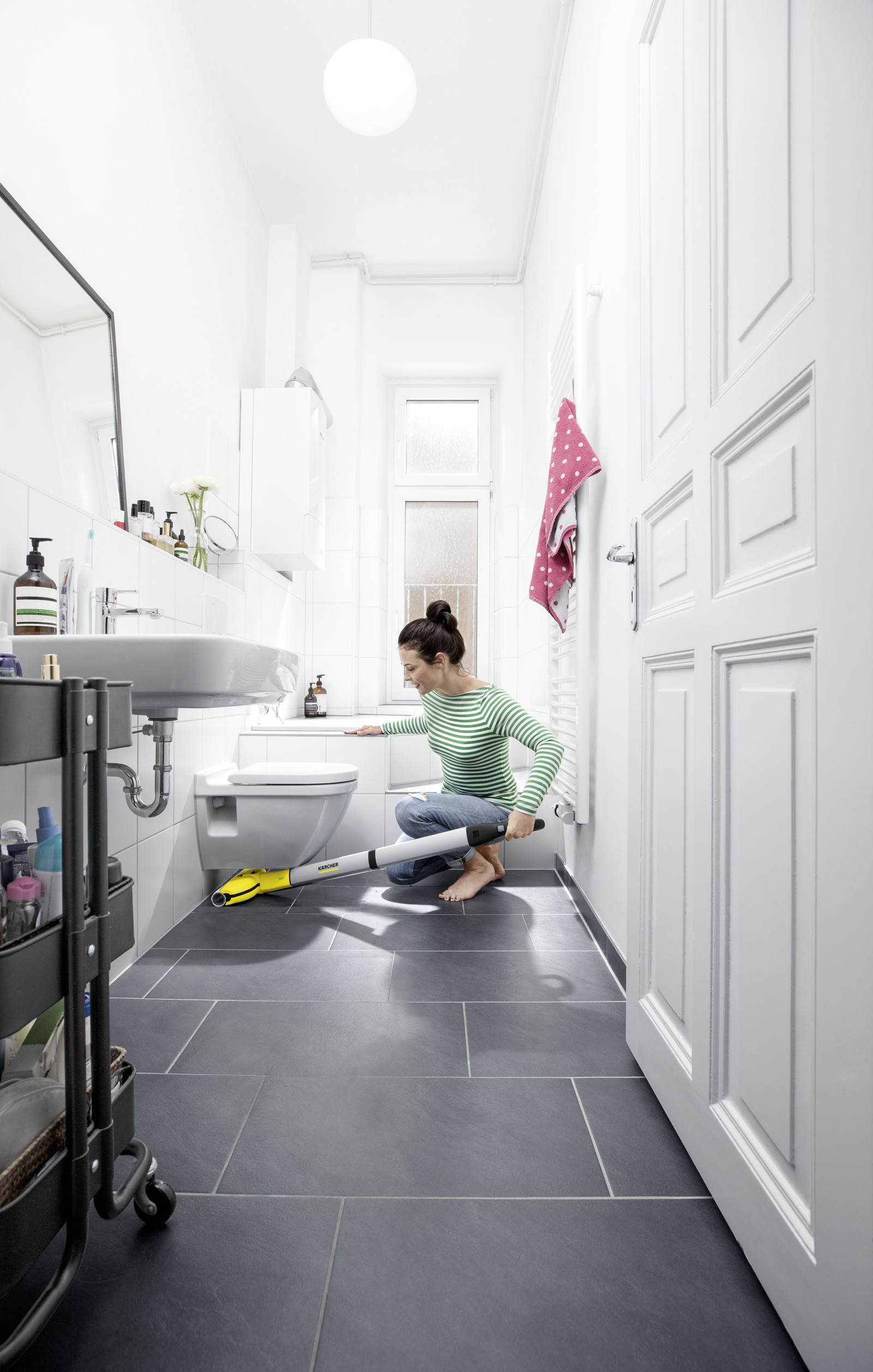 Les rouleaux rotatifs sont humidifiés en permanence avec de l'eau propre tandis que la saleté éliminée finit dans le réservoir d'eau sale. Avec son design ultra-mince, le FC 3 Cordless passe parfaitement sous les meubles et peut également être rangé dans peu d'espace.