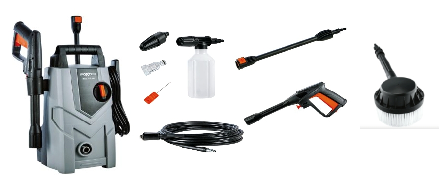 | Accessoires inclus | Comprend : 1 poignée pistolet avec système de sécurité intégré 1 lance 29 cm 1 buse à jet rotatif 1 brosse rotative (spécial lavage auto) 1 bidon connectable pour détergent 1 adaptateur d’alimentation en eau avec filtre 1 aiguille de nettoyage pour déboucher la buse en cas d’entartrage |