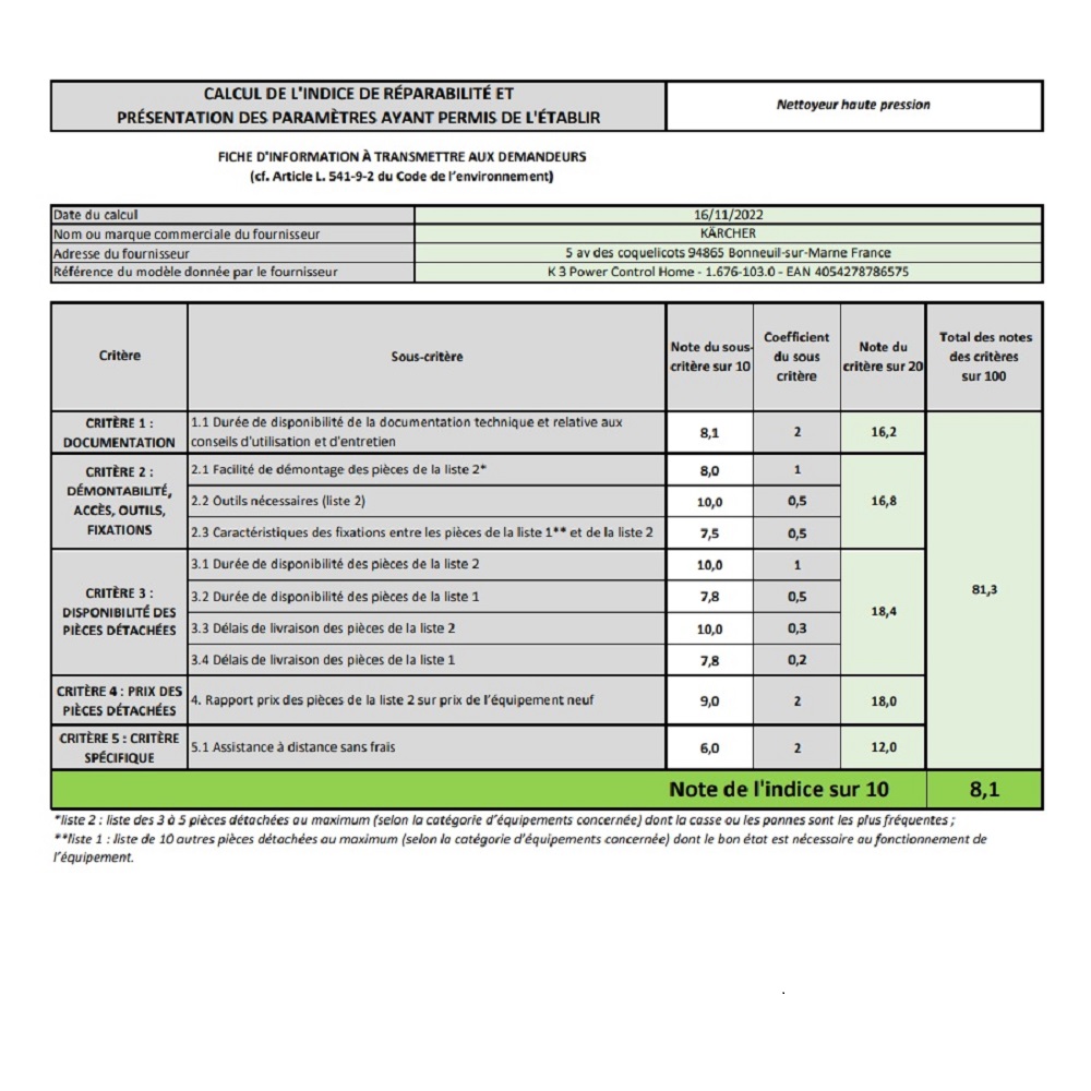 Indice de réparabilité 8,1 / 10