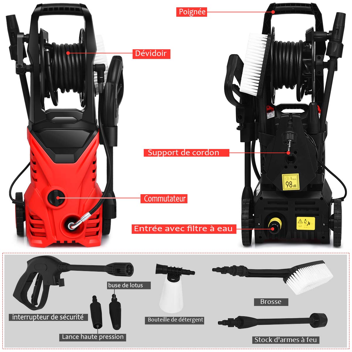 | Libellé | Nettoyeur haute pression 1500W 140bar 300L/H avec 1 buse lotus et 1 buse haute pression (Rouge) |