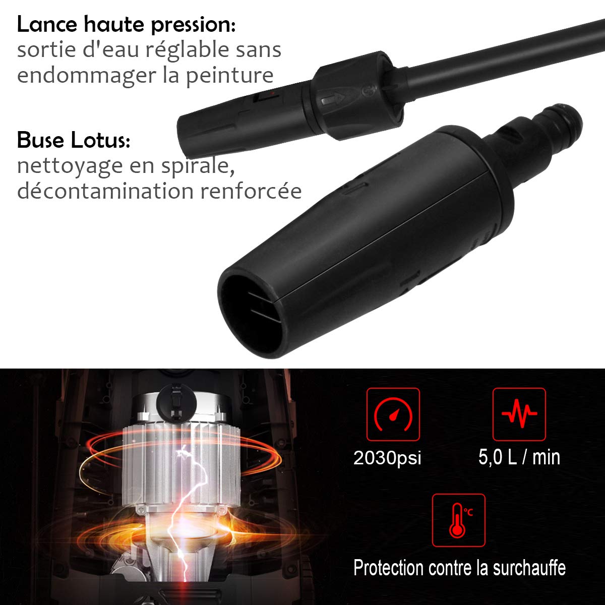 [ Nettoyeur haute pression puissant ] Le nettoyeur haute pression possède une excellente capacité de nettoyage, équipé d'une pression de 2030 PSI (140 Bar) et d'un débit d'eau de 5,0 L / min (300L/H) , il vous offre un nettoyage efficace et rapide. De plus, il émet peu de bruit pour vous offrir un environnement plus confortable.