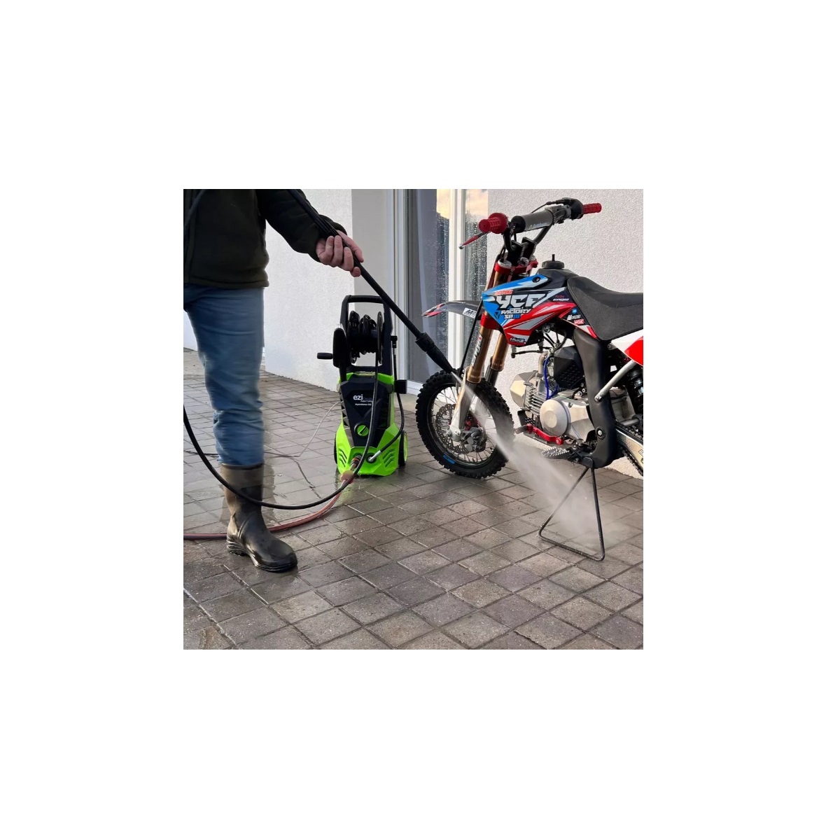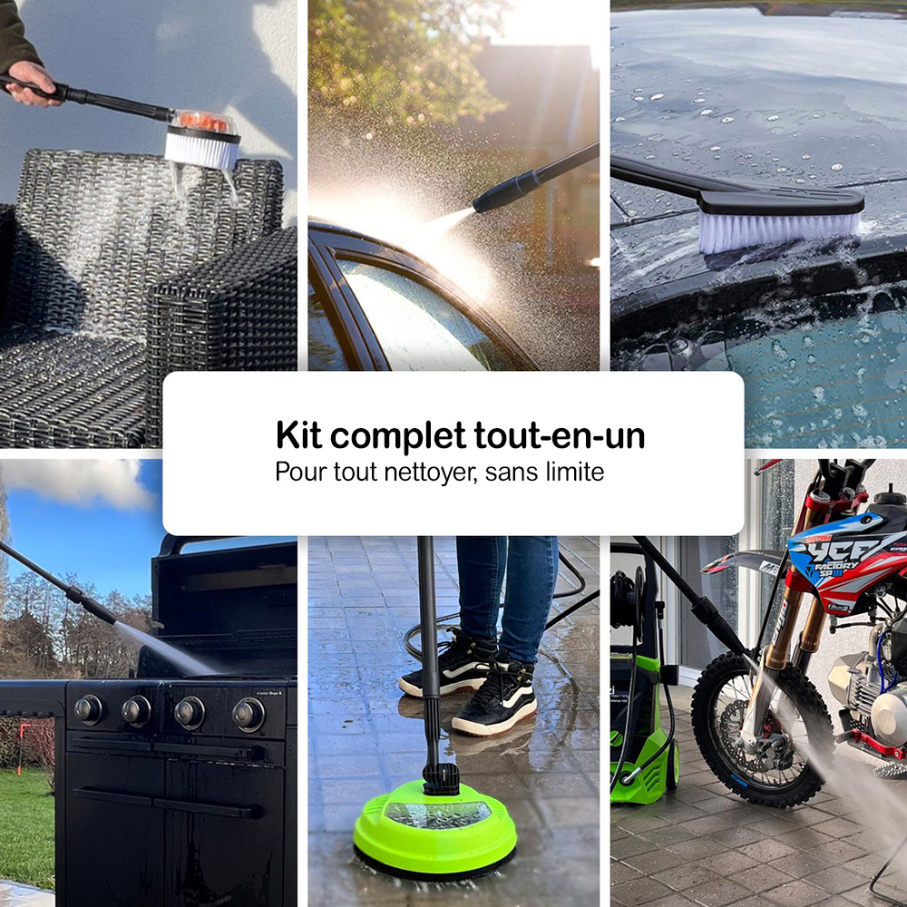 Puissant : usage régulier et intensif Avec ses 165 bars de pression et son moteur de 2200W, nettoyez, décrassez, et redonnez de l'éclat à toutes vos surfaces extérieures. Plus besoin d'insister ou de repasser plusieurs fois au même endroit, sa haute performance vous donne un confort de travail optimal. Équipé d'une cuve en aluminium et d'un flexible haute pression renforcés, il est robuste et parfait pour s'attaquer aux grandes tâches de nettoyage. Polyvalent 12 en 1 Grâce à sa grande accessoirisation, bénéficiez de 12 configurations possibles afin de répondre à tous les besoins de nettoyage de vos extérieurs. En quelques clips, nettoyez vos terrasses, vos gouttières, votre barbecue, votre voiture/moto, vos murs, etc.. Intelligemment conçu Équipé d'un enrouleur avec manivelle, enroulez et déroulez son flexible haute pression en toute simplicité. Sa poignée ergonomique et ses 2 roues latérales, seront des alliés de poids pour l'emmener partout. Son réservoir intégré permet l'ajout de solution nettoyante pour une efficacité accrue. En quelques clips, connectez et déconnectez ses accessoires sans le moindre effort. Turbobuse jet variable et rotabuse 360 La turbo buse à jet variable permet d'adapter la puissance de la haute pression à la surface à nettoyer. Augmenter ou diminuer la puissance en un tour de main, et obtenez un jet haute pression diffus ou précis et concentré. La rotabuse 360* haute pression est idéale pour le nettoyage du métal ou du plastique, le nettoyage des sols, le décapage de la peinture des bois extérieurs et l'élimination de la boue et de l'argile sur les allées. Son jet puissants ajoute une capacité de récurage supplémentaire au processus de nettoyage. Cela permet de nettoyer en profondeur les zones très sales ou très fréquentées. Brosse de lavage Avec ses longs poils souples lavez les véhicules, les roues et les jantes sans aucun risque de rayures. Une fois clipsée, la brosse de lavage est détectée par votre nettoyeur haute pression EZIclean® Hydroforce 165 et la solution nettoyante intégrée dans son réservoir sera automatiquement diluée et propulsée. Dégraissez, enlevez les taches de goudron, éliminez la poussière, les traces de boue, et les insectes collés en quelques instants et sans risque d'endommagement de la surface nettoyée. Brosse rotative La brosse rotative alimente ses engrenages rotatifs en utilisant la pression de l'eau. Elle est composé de poils souples et rigides, doté d'un traitement spécial velours non abrasif, adaptés au lavage des carrosseries de voitures, au lavage des vitres, et plus globalement au lavage des surfaces délicates. Une fois clipsée, la brosse rotative est détectée par votre nettoyeur haute pression EZIclean® Hydroforce 165 et la solution nettoyante intégrée dans son réservoir sera automatiquement diluée et propulsée. La rotation de la brosse permet un nettoyage supérieure des zones sales. Nettoyeur de terrasse Le nettoyeur de terrasses et murs, assure un nettoyage efficace et rapide des moyennes et grandes surfaces grâce à deux buses à jet plat rotatives et à son écartement de 24,5cm. Grâce à la pression des buses sur le sol, il est légèrement poussé vers le haut et flotte au-dessus du sol pour un confort d'utilisation optimale et une efficacité accrue. Nettoyez en quelques minutes vos terrasses en bois, en carrelage, le dallage de vos allées, et toutes les surfaces planes sales et encrassées.