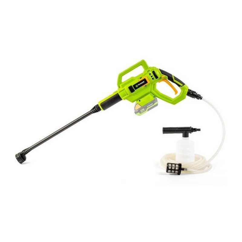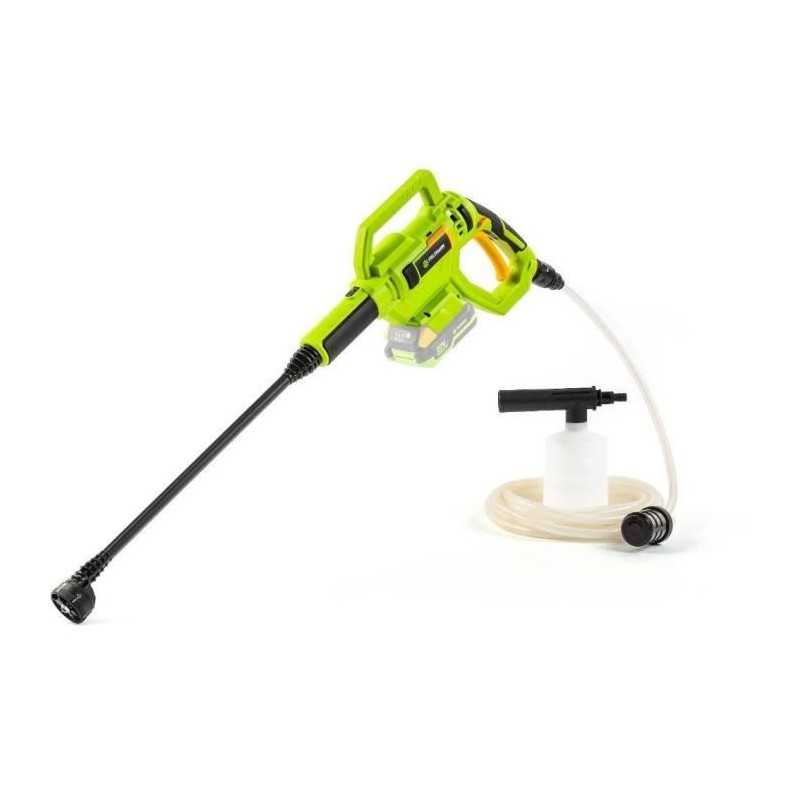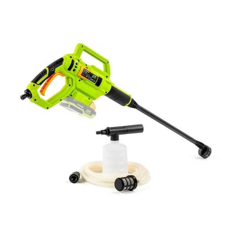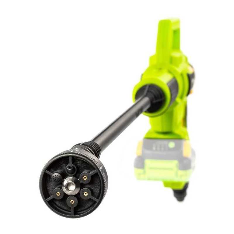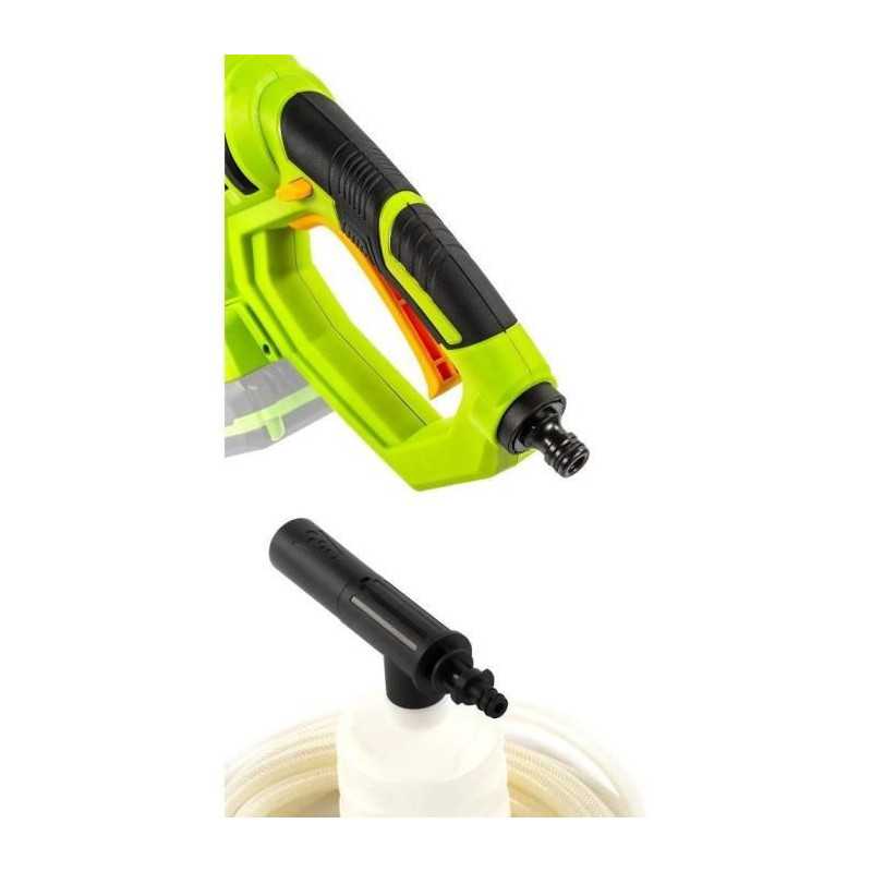 | Plus produit | Usage nomade; Buse 5-en-1; Poignée pistolet ergonomique; Tuyau auto-amorçant; Pot à mousse; Recharge rapide possible (chargeur non inclus) |