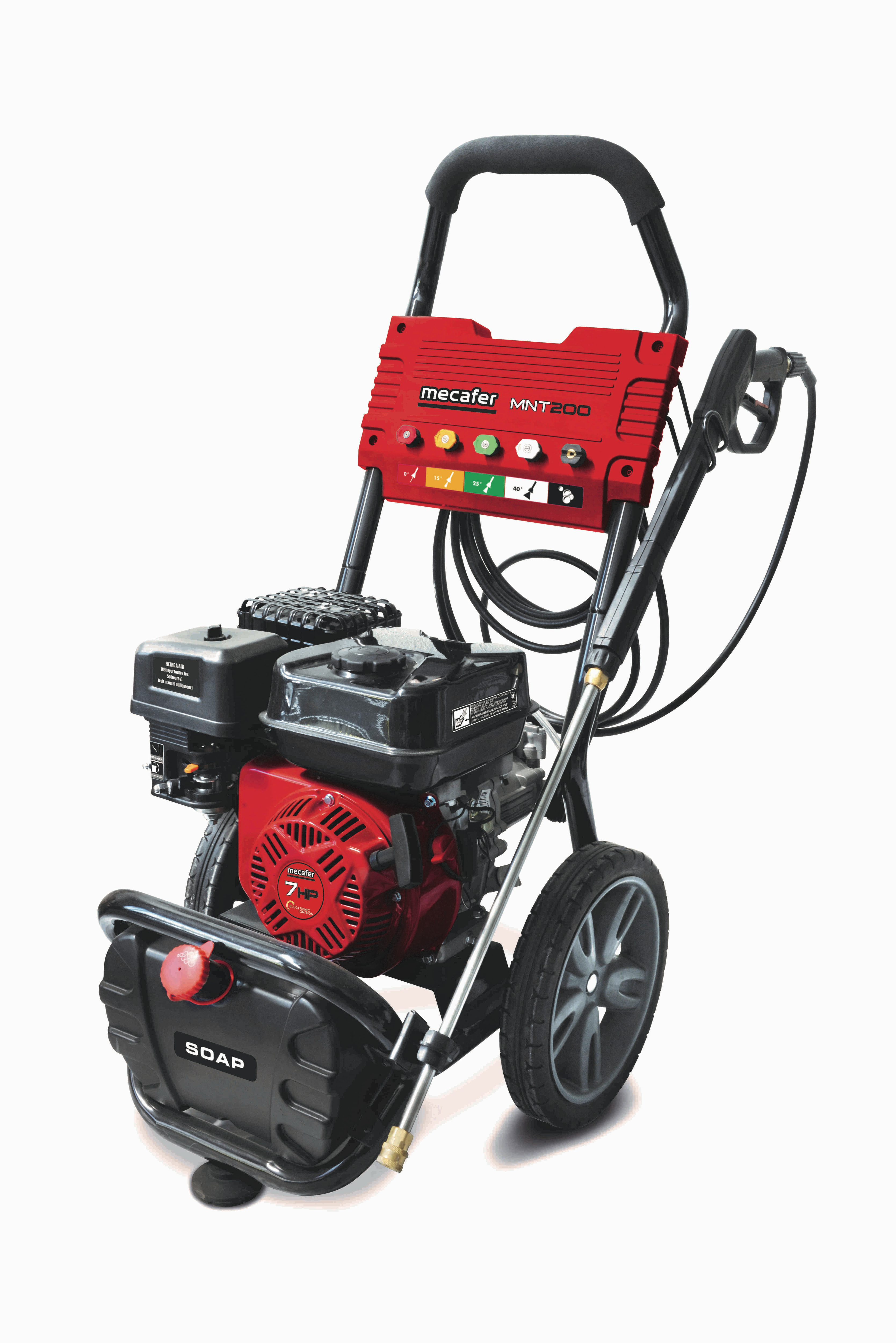 Nettoyeur Haute Pression thermique - MNT 215 - Mecafer Le nettoyeur thermique MNT200 est la solution idéale pour un nettoyage facile et efficace de vos extérieurs. Que vous souhaitiez redonner vie à votre terrasse, nettoyer votre voiture ou vos équipements, cet appareil combine puissance, autonomie et mobilité pour des résultats impeccables, sans effort. Nettoyage ultra-efficace : Pression de 206 bars pour venir à bout des salissures les plus résistantes. Gain de temps : Débit de 544 L/h pour nettoyer rapidement de grandes surfaces sans perte de performance. Autonomie prolongée : Réservoir de 3,6 L permettant jusqu’à 4 heures d’utilisation continue à 75% de capacité. Mobilité et maniabilité : Grandes roues et brancard ergonomique pour déplacer facilement l'appareil, même sur terrain difficile. Totalement autonome : Fonctionne avec de l’essence SP95E10 ou SP98, idéal pour un usage en extérieur, sans besoin de prise électrique. Professionnel Performant : Pompe Annovi Reverberi Italie Ultra puissant : pression max de 210 bar Fiable : moteur 4 temps OVH - SP95 E10 / SP98 Pression max : 213 bar Pression continue : 190 bar Débit max : 570 L/h Pompe axiale : 3 pistons corps laiton Annovi Reververi Type de moteur : 4 temps 208cc Carburant : SP95 E10 / SP98 Puissance maxi : 7HP Démarrage : lanceur manuel Réservoir : 3,5L autonomie : 3h Réservoir détergeant : 3,6L Tuyau PVC renforcé nylon : diamètre 13mm / Longueur : 7m Roues : plastique renforcé 12" Puissance sonore LWA : 105 db(A) Accessoires : 4 buses : 0°, 15°, 40°, spécial savon Lance 220 bar avec gâchette de sécurité Garantie 2 ans pièces et main d'oeuvre