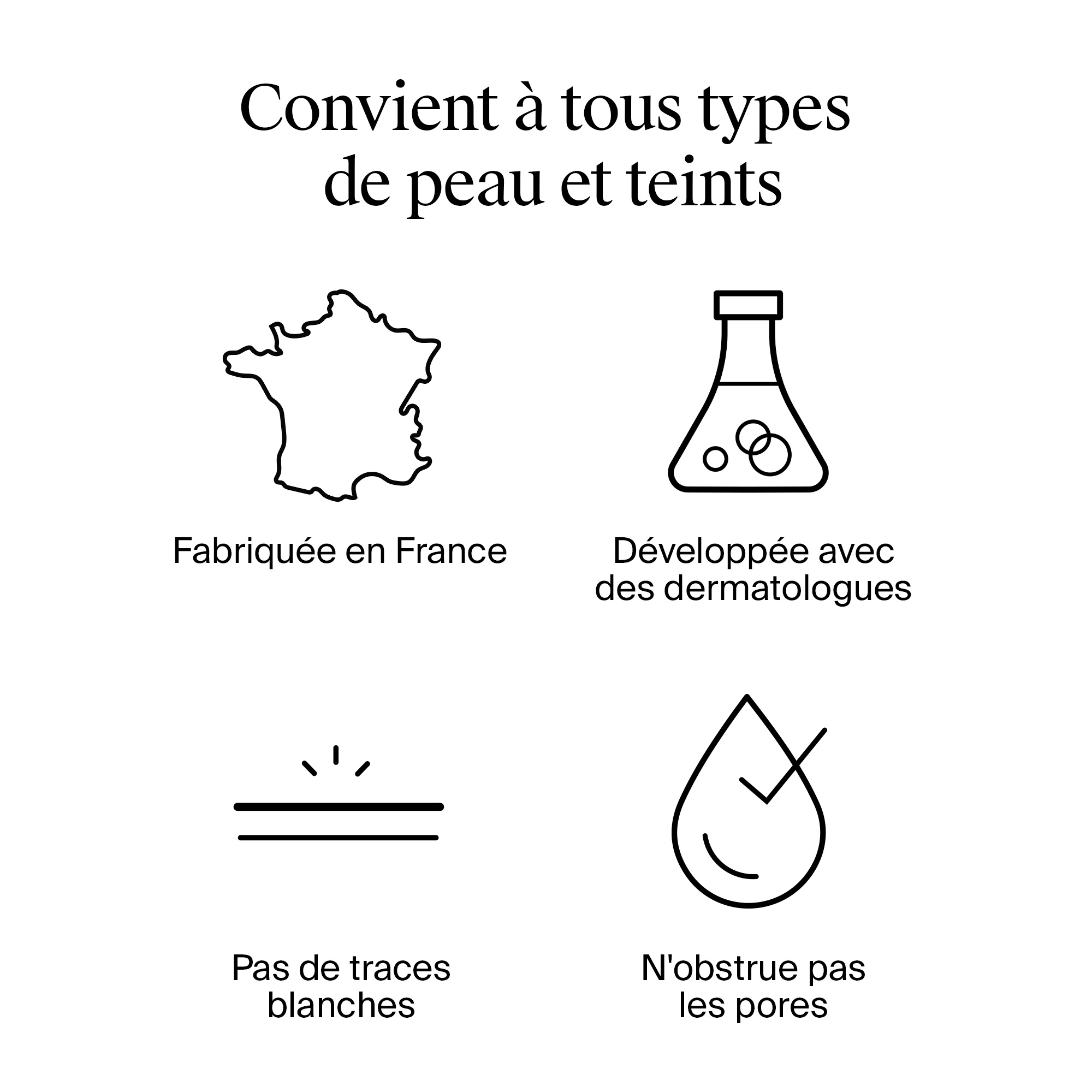 Formule LÉGÈRE PAS de traces blanches RÉSULTATS VISIBLES EN 1 SEMAINE*** 92% affirment INSTANTANÉMENT ressentir leur peau hydratée 1 SEMAINE pour une peau plus lisse et éclatante ***Auto-évaluation, 125 volontaires, une application quotidienne. TECHNOLOGIE BREVETÉE MICRO-PEPTIDES Développée avec des dermatologues. Conçu de petite taille pour une distribution optimisée pour maintenir le collagène. Convient à un usage quotidien et aux peaux sensibles. Pour tous types de peau et teints. Pas de traces blanches. N’obstrue pas les pores.