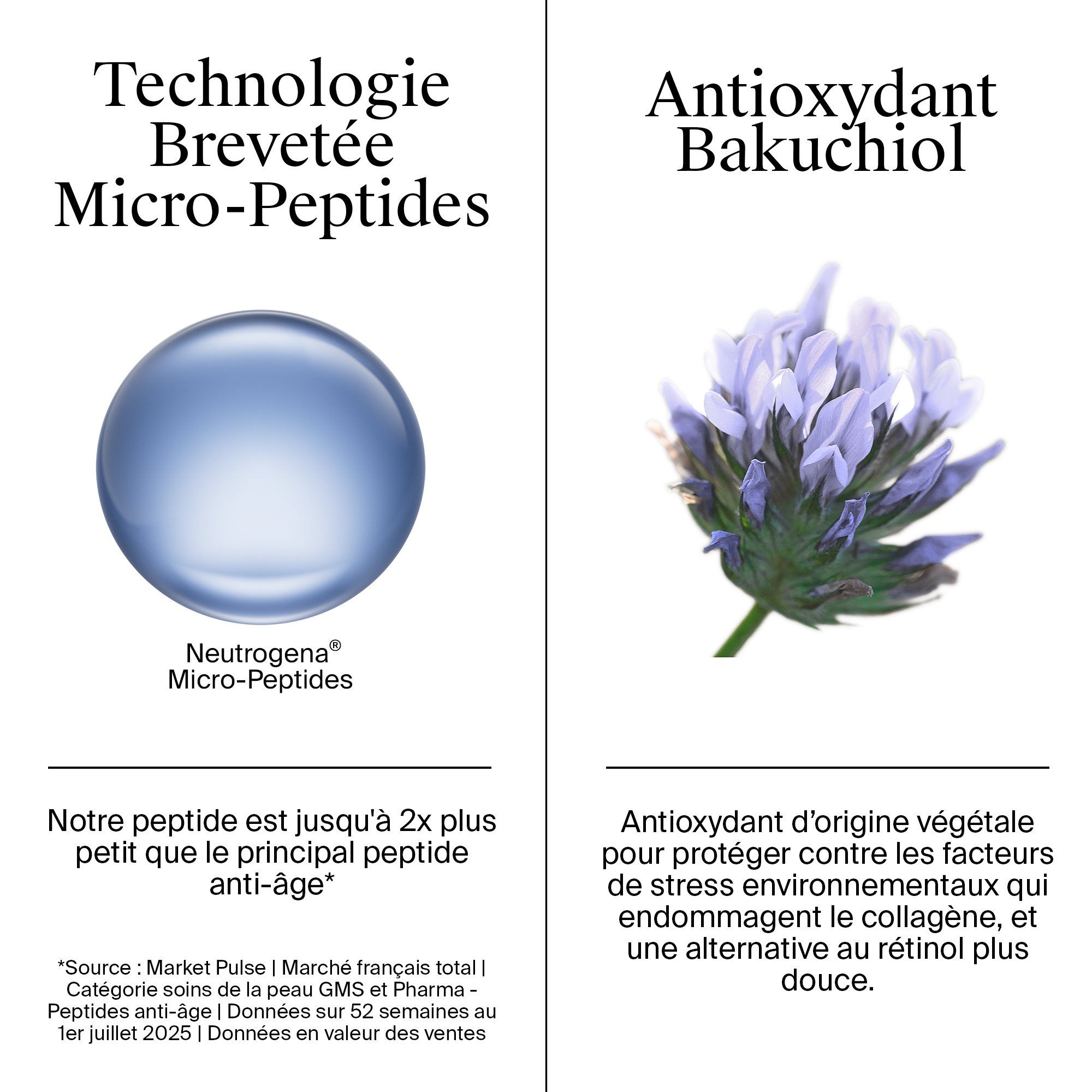 RÉSULTATS VISIBLES EN 1 SEMAINE*** 92% affirment INSTANTANÉMENT ressentir leur peau hydratée 1 SEMAINE pour une peau plus lisse et éclatante CLINIQUEMENT PROUVÉ** 95% ONT EU une peau plus ferme 87% ONT EU une amélioration de l’élasticité de la peau. *** Auto-évaluation, 112 volontaires, application deux fois par jour. TECHNOLOGIE BREVETÉE MICRO-PEPTIDES Développée avec des dermatologues. Conçu de petite taille pour une distribution optimisée pour maintenir le collagène. Collagène d’origine naturel L'antioxydant Bakuchiol, protège contre les facteurs de stress environnementaux qui endommagent le collagène et aide à combattre les signes précoces du vieillissement. Une alternative au rétinol plus douce et d’origine végétale. Convient à un usage quotidien et aux peaux sensibles. Pour tous types de peau et teints. N’obstrue pas les pores.