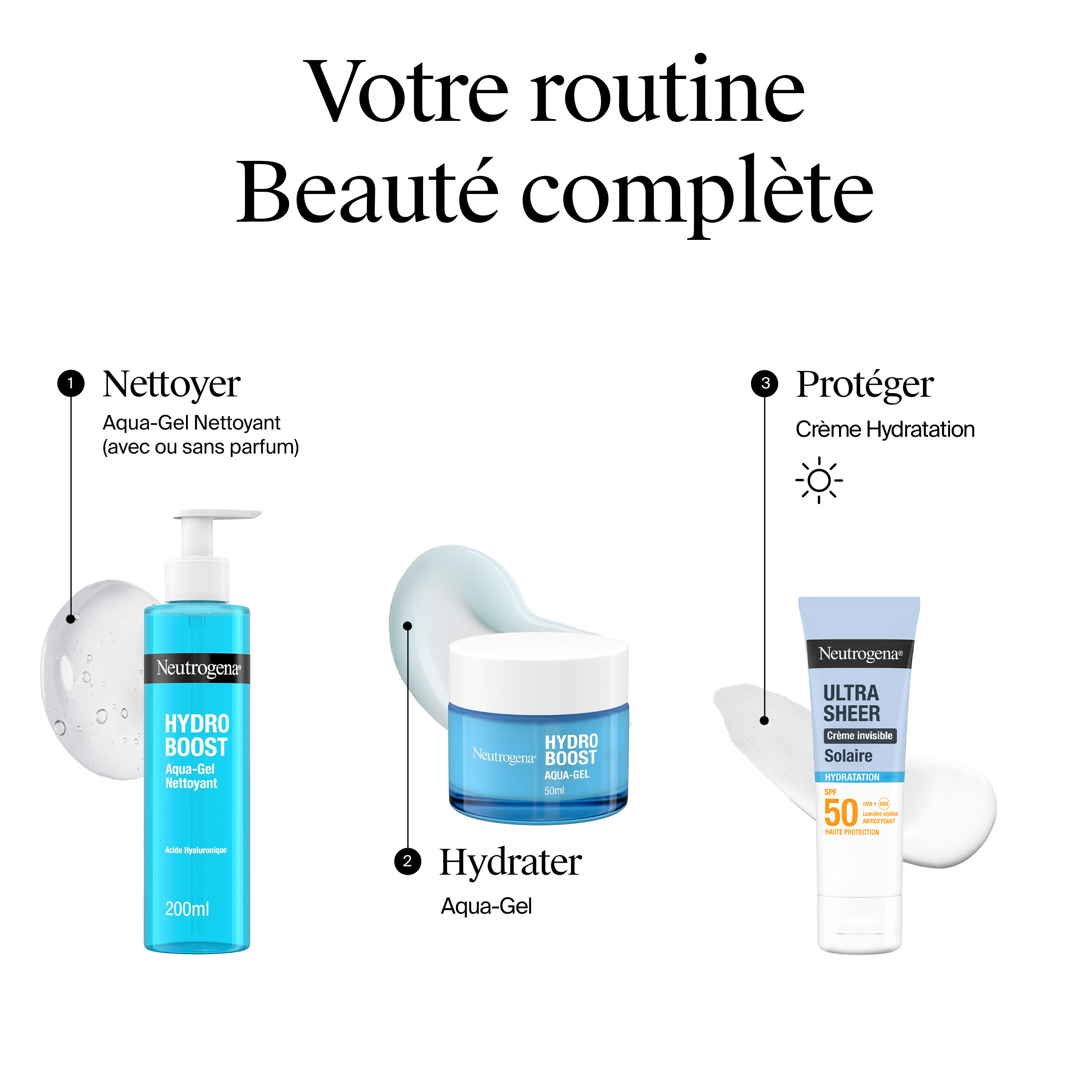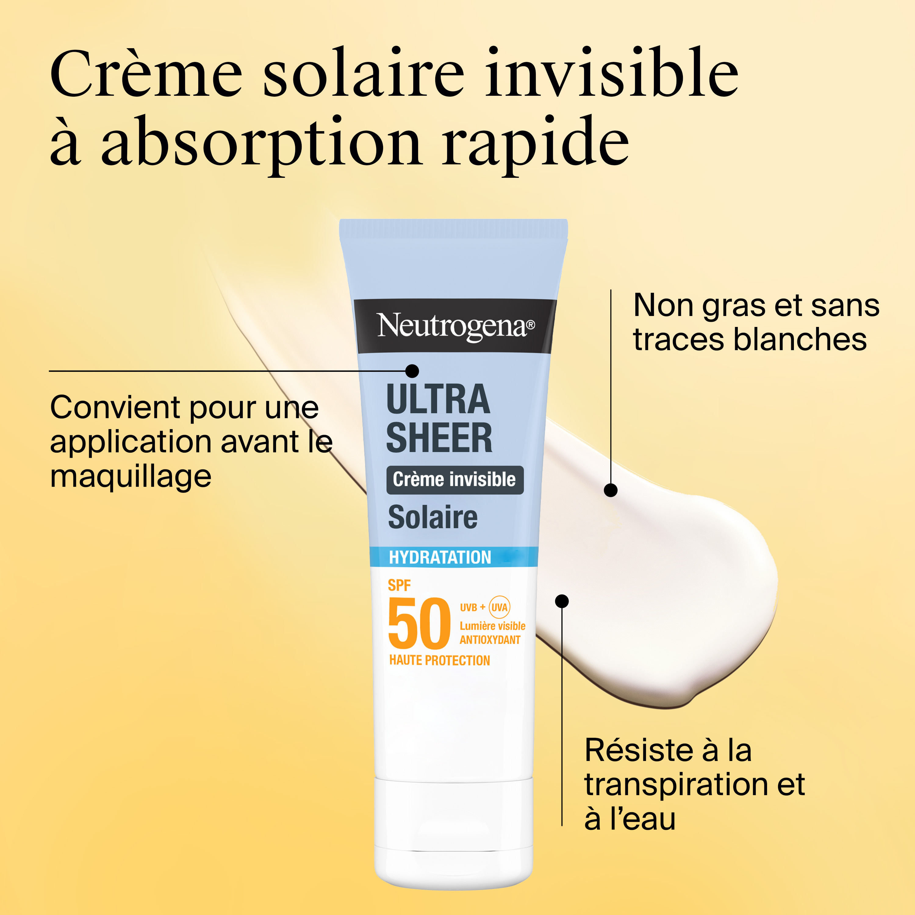 Neutrogena Ultra Sheer Crème Solaire Invisible Hydratation SPF 50 TESTÉ SOUS CONTRÔLE DERMATOLOGIQUE Avec la technologie Helioplex SL®, elle offre une protection à large spectre contre les UVB, les UVA longs, la lumière visible et la pollution. Formulée avec de la glycérine, du panthénol, des pro-céramides et des vitamines C et E antioxydantes, elle aide à lutter contre les signes du vieillissement prématuré causés par l’exposition au soleil et les agressions externes, offre une hydratation intense pendant 24h et préserve la barrière cutanée. Peaux sèches à très sèches. Convient aux peaux sensibles. CRÈME INVISIBLE EXCEPTIONNELLE Texture crème ultra-confortable au toucher sec. Non gras. Sans traces blanches. Convient pour une application avant le maquillage. Résiste à la transpiration et à l’eau. Idéal pour un usage quotidien. Fabriqué en France. Hypoallergénique*. Non comédogène. Sans parfum Testé sous contrôle ophtalmologique. Ne pique pas les yeux. *Formulé pour minimiser les risques d’allergie