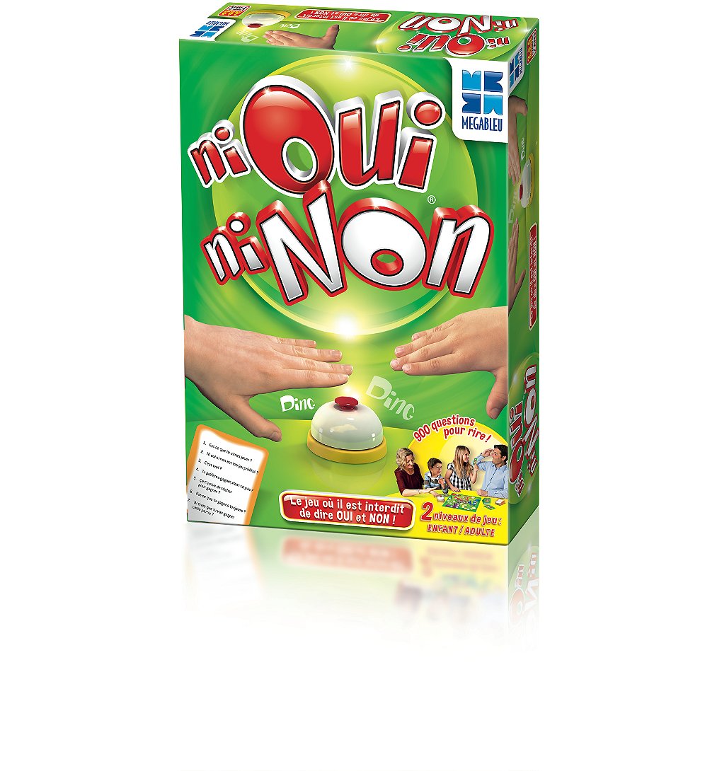« Tu aimes jouer ? » - « Tu sais nager ? » -« Oui » - « Perdu ! » il ne fallait dire ni « Oui » ni « Non » ! Les 900 questions habilement enchaînées pour faire flancher toute la famille (cartes enfants ou adultes) vont en surprendre plus d’un ! Un jeu de rapidité simple et drôle pour réunir petits et grands ! De 2 à 6 joueurs. A partir de 7 ans et plus. Contenu : 1 plateau de jeu, 6 pions, 1 sonnette, 110 cartes, 1 support de cartes, 1 notice.