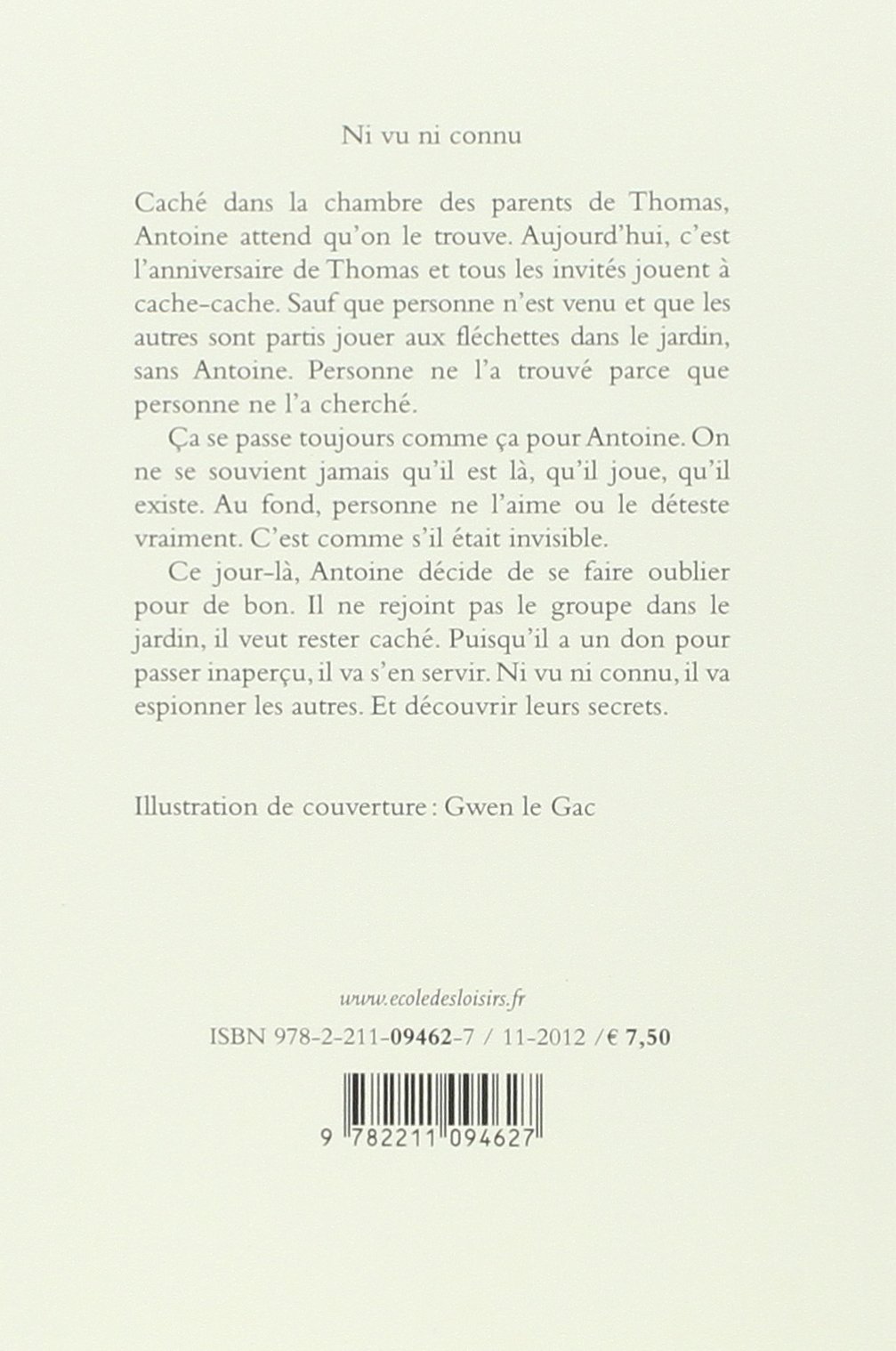 Ce jour-là, Antoine décide de se faire oublier pour de bon. Il ne rejoint pas le groupe dans le jardin, il veut rester caché. Puisqu'il a un don pour passer inaperçu, il va s'en servir. Ni vu ni connu, il va espionner les autres. Et découvrir leurs secrets.