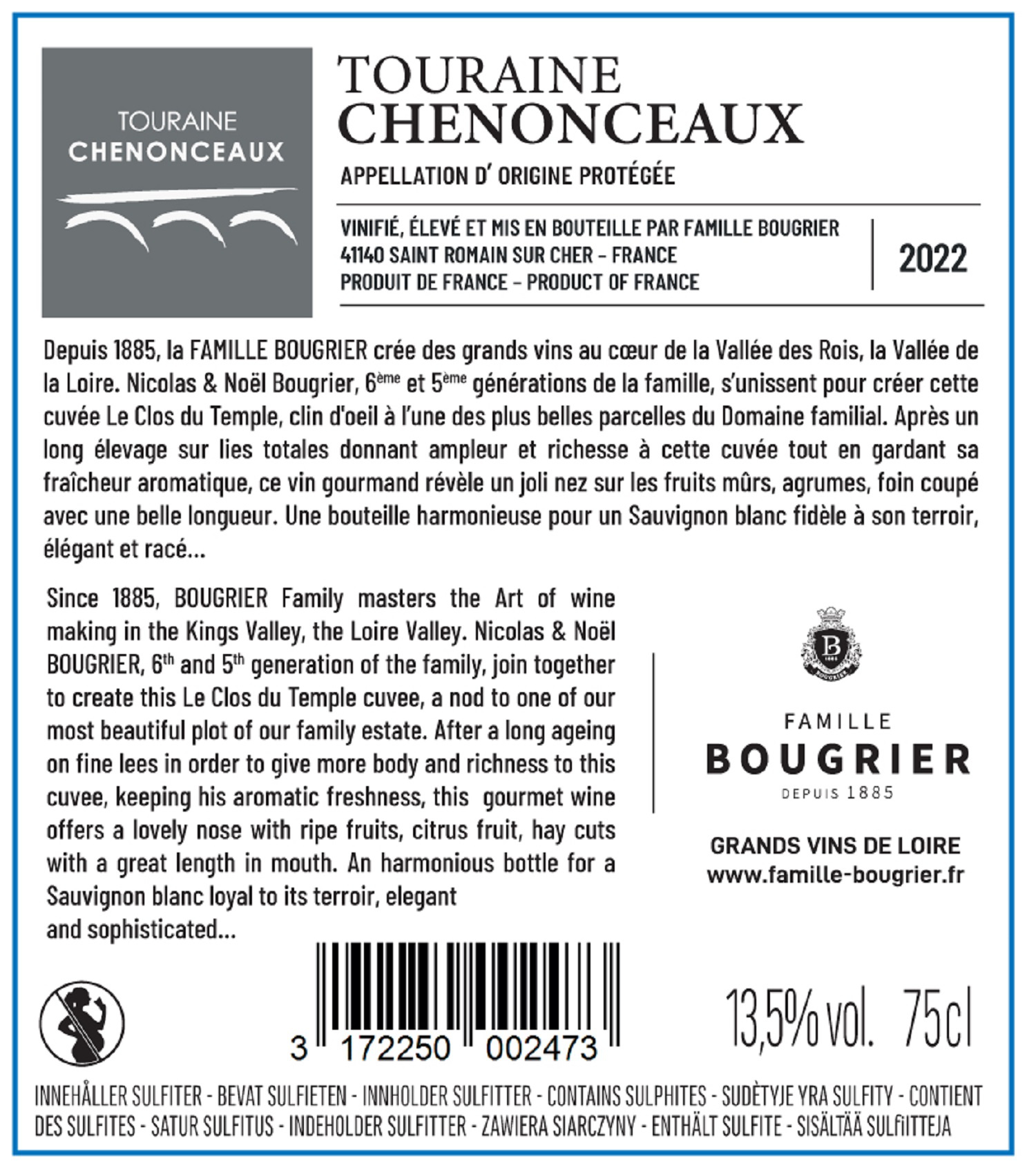 | Libellé | Nicolas & Noël Bougrier Le Clos du Temple, 2022 - Touraine Chenonceaux AOP - Blanc Sec - 75 cl |