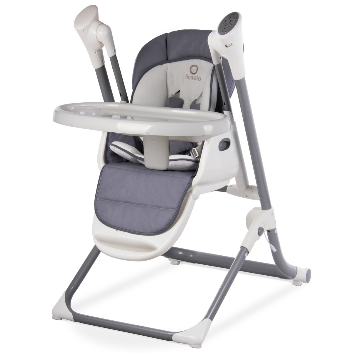 NILES : Chaise haute + Transat + Balancelle motorisée et connectée, marque LIONELO. De la naissance jusqu'à 3 ans. CARACTÉRISTIQUES : Produit connectée 3 en 1 : balancelle, transat et chaise haute. Fonction balancelle de 0 à 9 kg (autonome et motorisée). Fonction chaise haute jusqu'à 20 kg (réglable en hauteur sur 6 positions), pour s'adapter à vos besoins. La balancelle NILES se balance automatiquement grâce au moteur intégré et silencieux (adapte la vitesse au poids de l'enfant). 12 mélodies et sonorités naturels peuvent être diffusés. 1 prise USB permet de charger vos propres musiques (format MP3). Le panneau de contrôle permet de gérer les fonctions (activer le balancement pendant 8, 15 ou 30 mn, vitesse, musiques, etc...). NILES dispose d'un harnais de sécurité à 5 points et de pieds antidérapants. L'assise confortable est en mousse à mémoire de forme. La balancelle / chaise-haute est pliable. Alimentation électrique incluse (ou avec 4 piles AA non incluses). Normes de sécurité Européennes : EN-14988 et EN-71. EN MODE TRANSAT ET BALANCELLE : L'arche de jeux est amovible pour installer le plateau repas en mode chaise-haute. L'arche inclut 2 peluches. Le siège du transat/balancelle est inclinable sur 2 positions (semi-allongée ou allongée). L'application Swing Control (compatible smartphones Androïd et IOS) permet de piloter les fonctions à distance (détection sonore, activer le balancement, activer la musique, etc...). MODE CHAISE HAUTE : Dossier réglable sur 4 hauteurs. La chaise est réglable en hauteur sur 6 positions pour s'adapter avec votre table. Le plateau repas amovible est réglable sur 3 positions. Le repose-pieds est réglable en hauteur (4 positions). DIMENSIONS / POIDS : Dimensions : H. 102 x L. 72 x P. 59 cm. Poids : 11,6 kg. Structure : acier. Revêtement : tissu polyester.