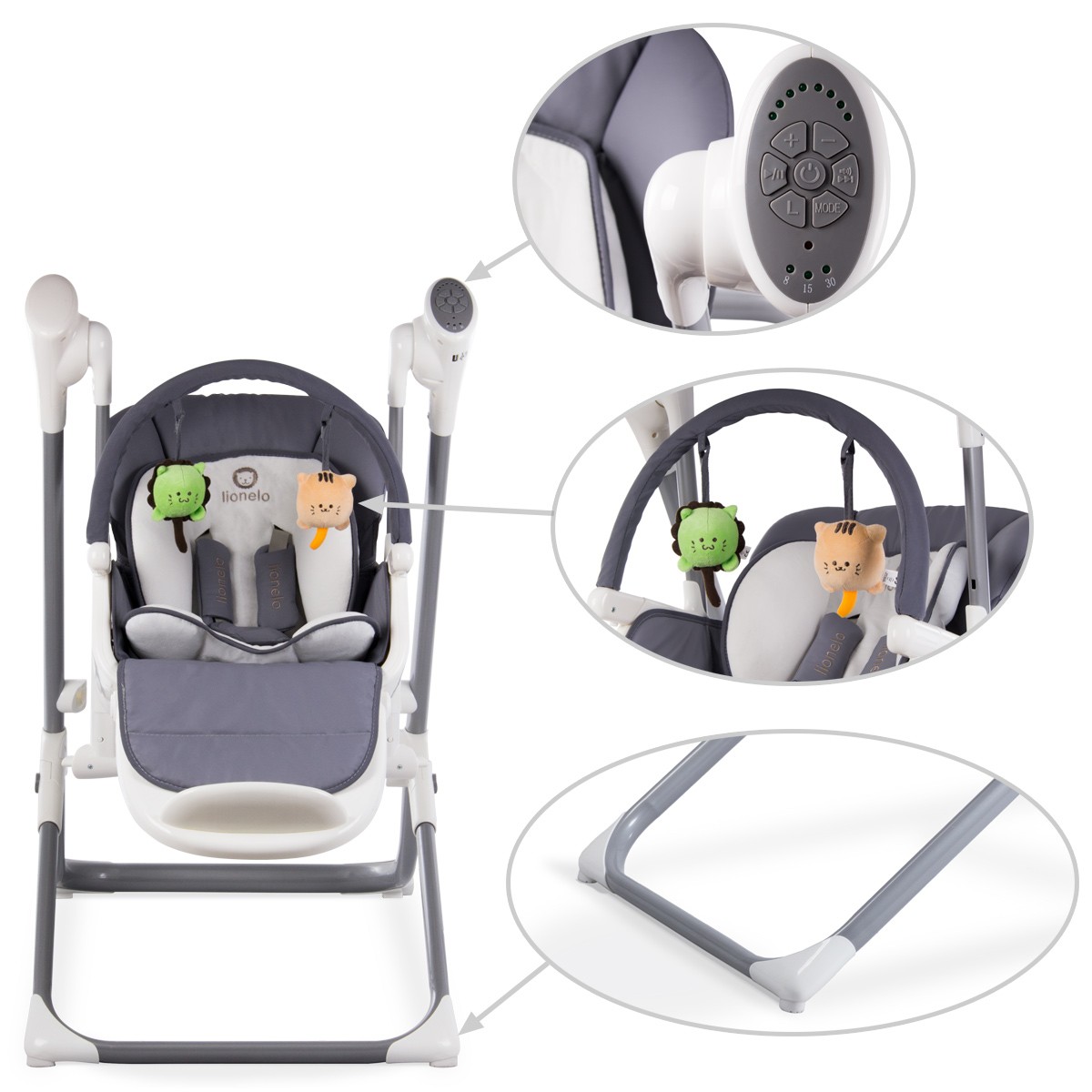 NILES : Chaise haute + Transat + Balancelle motorisée et connectée, marque LIONELO. De la naissance jusqu'à 3 ans. CARACTÉRISTIQUES : Produit connectée 3 en 1 : balancelle, transat et chaise haute. Fonction balancelle de 0 à 9 kg (autonome et motorisée). Fonction chaise haute jusqu'à 20 kg (réglable en hauteur sur 6 positions), pour s'adapter à vos besoins. La balancelle NILES se balance automatiquement grâce au moteur intégré et silencieux (adapte la vitesse au poids de l'enfant). 12 mélodies et sonorités naturels peuvent être diffusés. 1 prise USB permet de charger vos propres musiques (format MP3). Le panneau de contrôle permet de gérer les fonctions (activer le balancement pendant 8, 15 ou 30 mn, vitesse, musiques, etc...). NILES dispose d'un harnais de sécurité à 5 points et de pieds antidérapants. L'assise confortable est en mousse à mémoire de forme. La balancelle / chaise-haute est pliable. Alimentation électrique incluse (ou avec 4 piles AA non incluses). Normes de sécurité Européennes : EN-14988 et EN-71. EN MODE TRANSAT ET BALANCELLE : L'arche de jeux est amovible pour installer le plateau repas en mode chaise-haute. L'arche inclut 2 peluches. Le siège du transat/balancelle est inclinable sur 2 positions (semi-allongée ou allongée). L'application Swing Control (compatible smartphones Androïd et IOS) permet de piloter les fonctions à distance (détection sonore, activer le balancement, activer la musique, etc...). MODE CHAISE HAUTE : Dossier réglable sur 4 hauteurs. La chaise est réglable en hauteur sur 6 positions pour s'adapter avec votre table. Le plateau repas amovible est réglable sur 3 positions. Le repose-pieds est réglable en hauteur (4 positions). DIMENSIONS / POIDS : Dimensions : H. 102 x L. 72 x P. 59 cm. Poids : 11,6 kg. Structure : acier. Revêtement : tissu polyester.