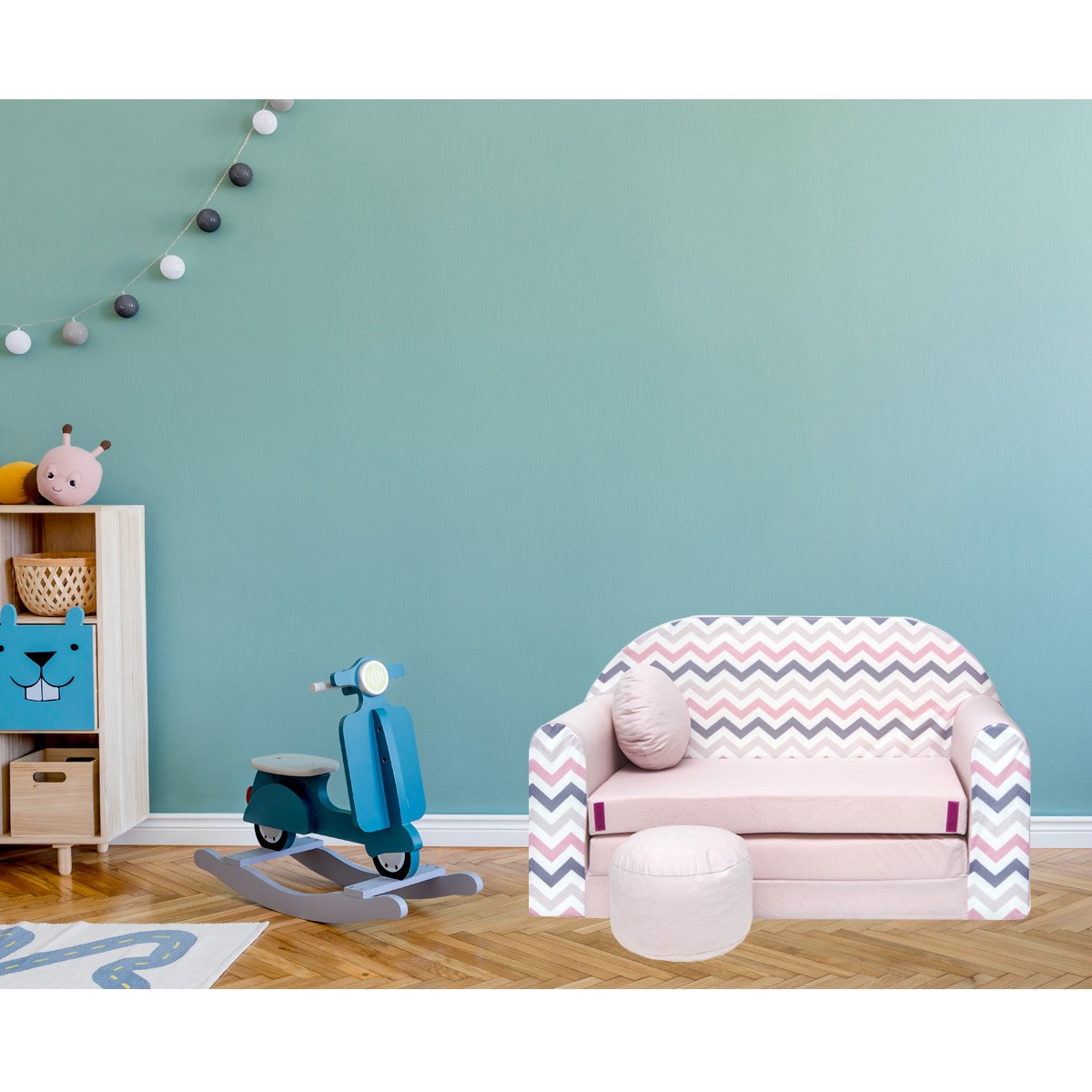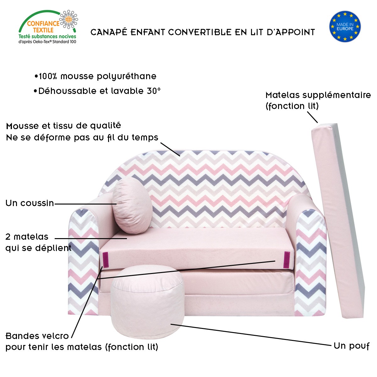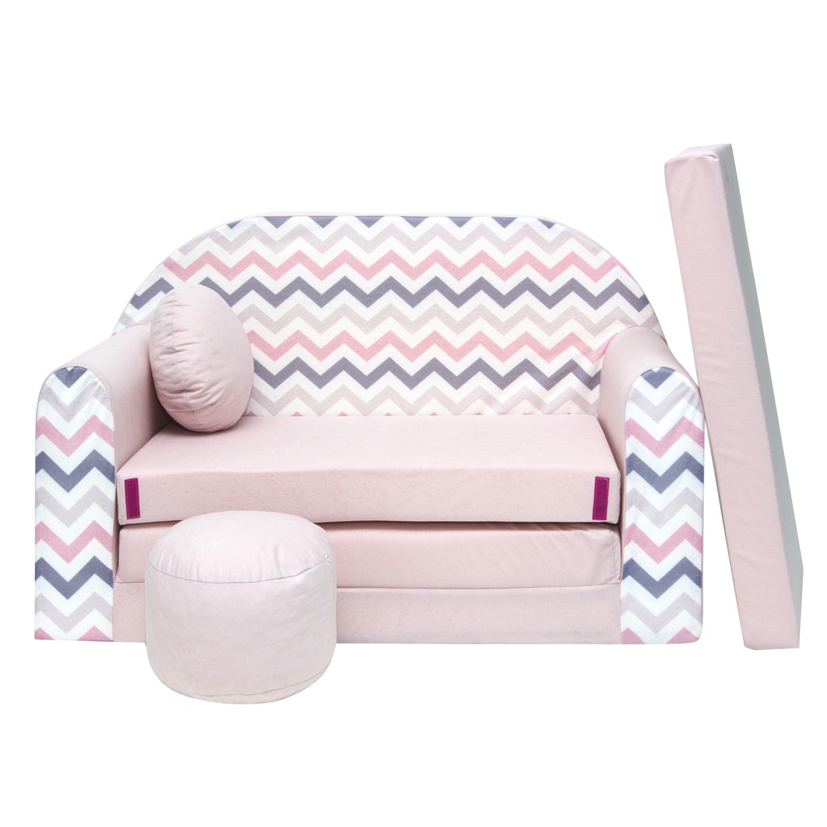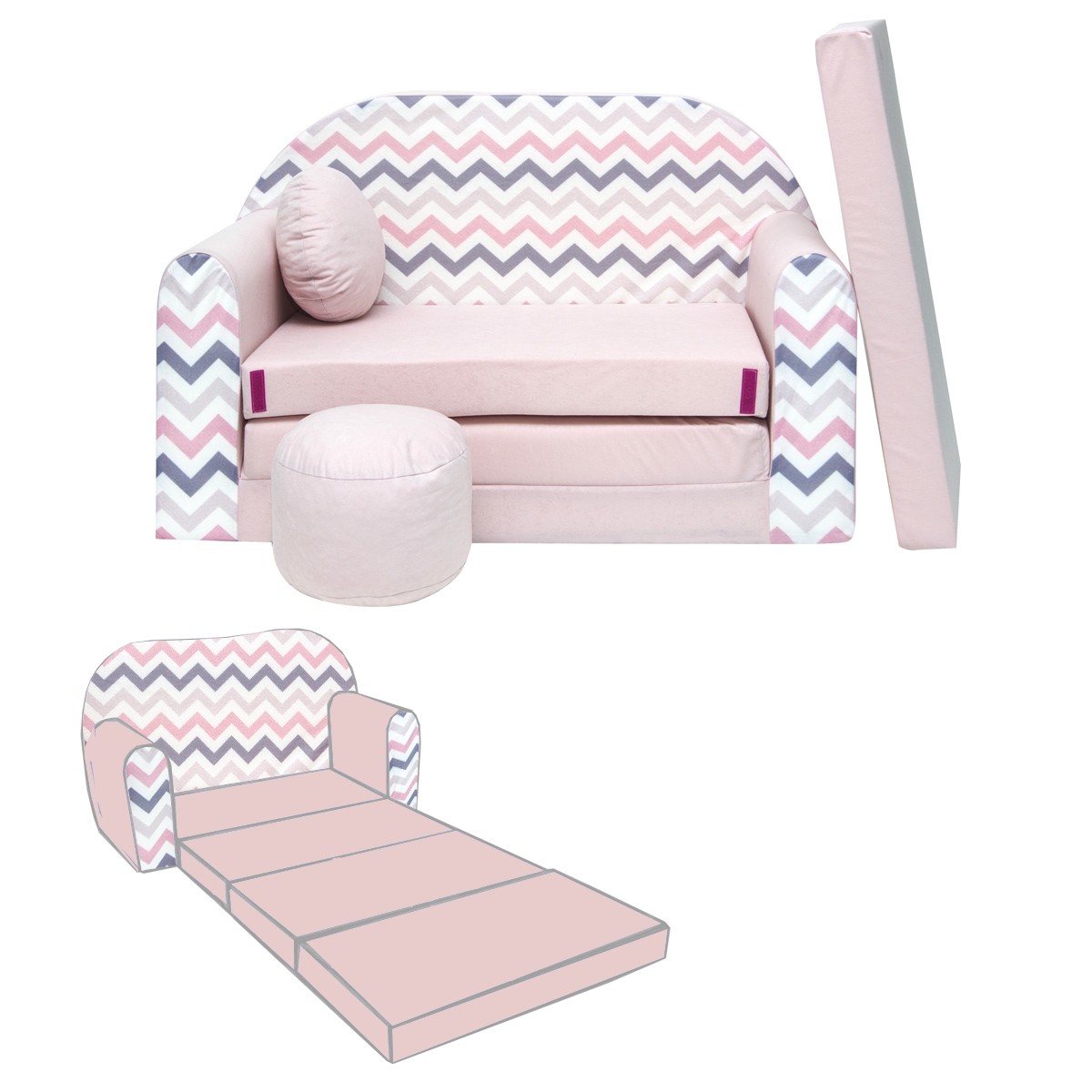 Libellé NINO Canapé convertible lit pour enfant avec pouf et coussin OEKO-TEX Rose avec zigzag