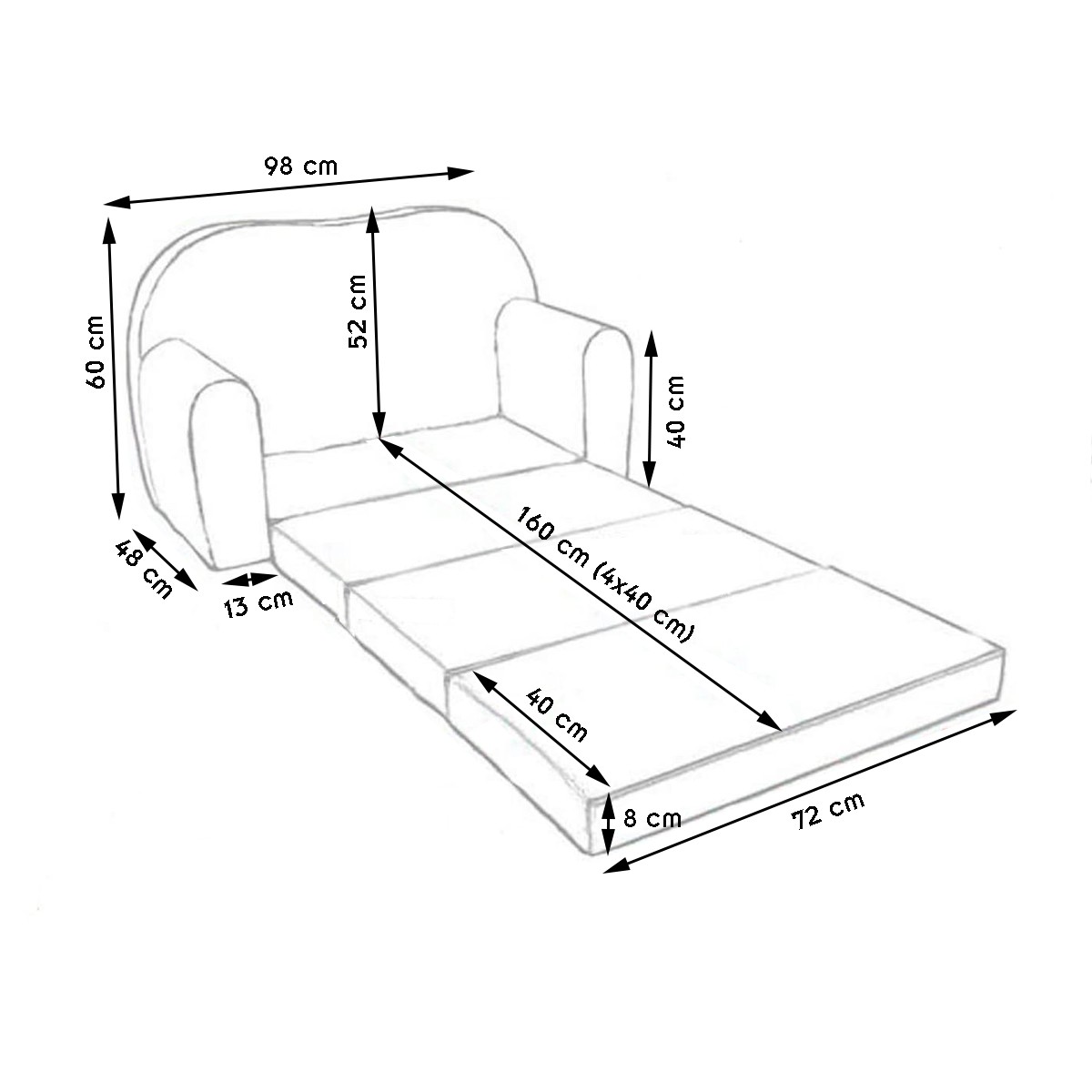 Divan enfant 2 places modulable en lit Existe en plusieurs modèles. CARACTÉRISTIQUES : Votre enfant va adorer ce canapé convertible en lit adapté à sa taille. Véritable petit cocon douillet, ce divan est parfait pour jouer, lire ou faire une petite sieste avec son lit dépliable. La structure, l'assise, les accoudoirs et les matelas de ce sofa sont entièrement composés de mousse, pour un maximum de confort et de douceur. Son enveloppe en tissu est certifié OEKO-TEX (ne contient pas de produits nocifs). Accompagné d'un coussin et d'un pouf, ce canapé convertible se transforme en lit d'appoint avec son matelas supplémentaire qui se fixe à l'aide de bandes velcro, offrant une longueur de couchage de 160 cm. Léger et simple à déplier, les enfants peuvent le déplacer et le moduler en lit facilement. Les couleurs vives et les motifs modernes raviront les petits comme les grands. Pour un entretien facile, il est entièrement déhoussable. Les housses sont lavables en machine à 30°. Destiné aux enfants jusqu'à 6 ans. Fabriqué avec des matériaux de bonne qualité, il ne se déforme pas à l'usage. 100% mousse de polyuréthane. Fabriqué en Europe. L'ENSEMBLE CONTIENT : - un canapé convertible 2 places - un pouf - un coussin - un matelas POIDS ET DIMENSIONS : Dimensions canapé plié: L 98 cm x l 48 cm x H 60 cm Dimensions lit : L 160 cm x l 72 cm x H 8 cm Poids total : 6 kg