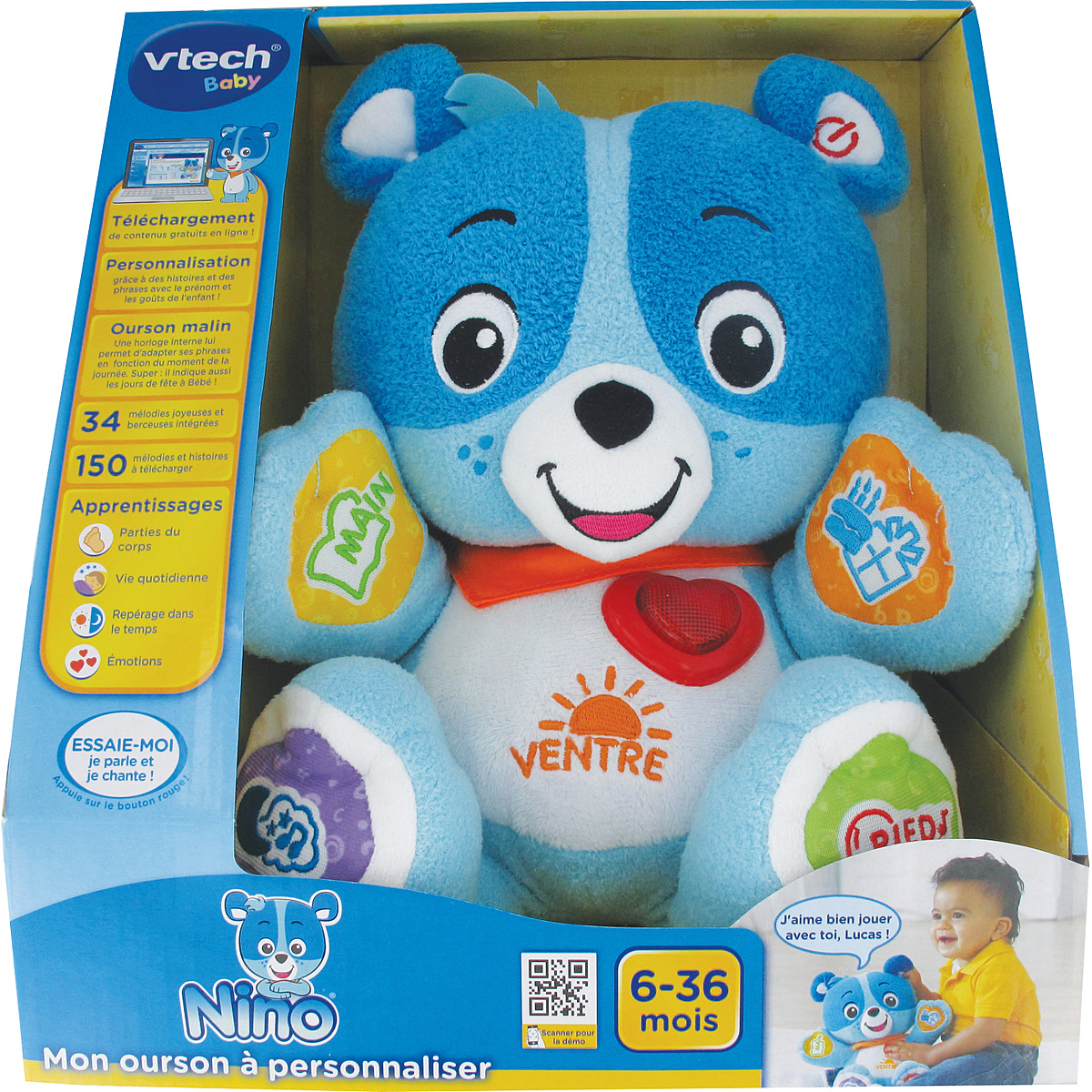 Un adorable ourson à câliner qui accompagne Bébé au quotidien : grâce à la connexion à l'Explor@ Park, on peut personnaliser Nino pour qu'il connaisse tout de Bébé : son prénom, son anniversaire, sa couleur ou ses plats préférés