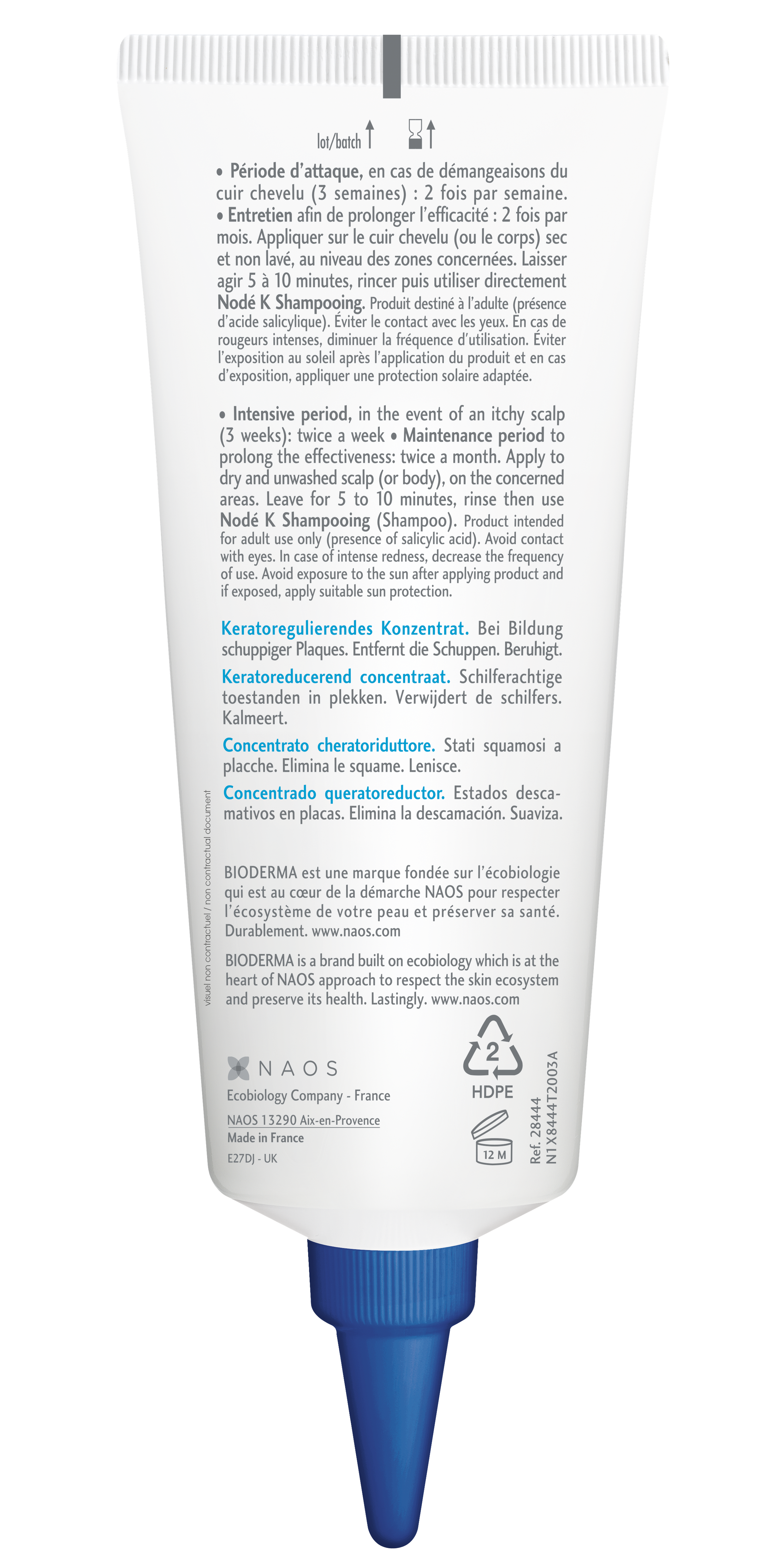 Nodé K concentré est un soin cuir chevelu apaisant anti-squames. Il permet d'apaiser les démangeaisons et de réduire les pellicules et les squames. Les cuirs chevelus sensibles ont besoin de soin spécifique. Ce produit est enrichi en karité et en agents émollients intenses. Ils offrent une sensation d'apaisement et de confort. L'action kératoréductrice de ce concentré participe à l'élimination des plaques. Votre cuir chevelu est visiblement et durablement assaini. En traitement anti-démangeaison, appliquez-le pendant 3 semaines, deux fois par semaine. Ensuite, appliquez-le deux fois par mois. Pour plus d'efficacité, associez-le à un shampoing doux anti-squame. Ce produit est formulé et fabriqué en France.