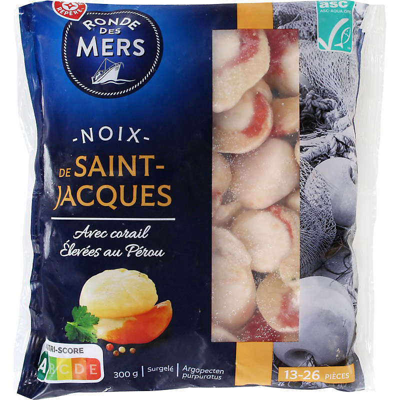 NOIX DE SAINT-JACQUES (ARGOPECTEN PURPURATUS) AVEC CORAIL ELEVEES AU PEROU, SURGELEES. NOMBRE DE PIÈCES : 13/26. RONDE DES MERS