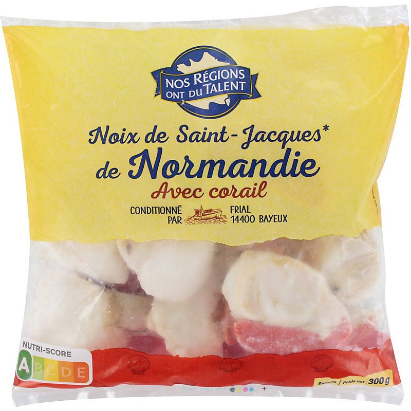 NOIX DE SAINT-JACQUES (PECTEN MAXIMUS) DE NORMANDIE, AVEC CORAIL - ORIGINE FRANCE - SURGELEES, PÊCHÉES À LA DRAGUE EN ATLANTIQUE NORD EST DANS LA MANCHE NOS REGIONS ONT DU TALENT