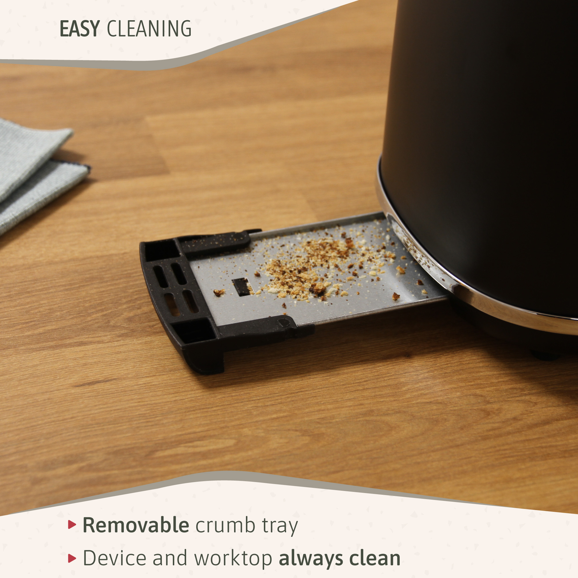 - Nettoyage facile : Le plateau amovible vous permet de nettoyer les miettes de pain grillé, ce qui contribue à maintenir l'appareil et votre plan de travail propres.
