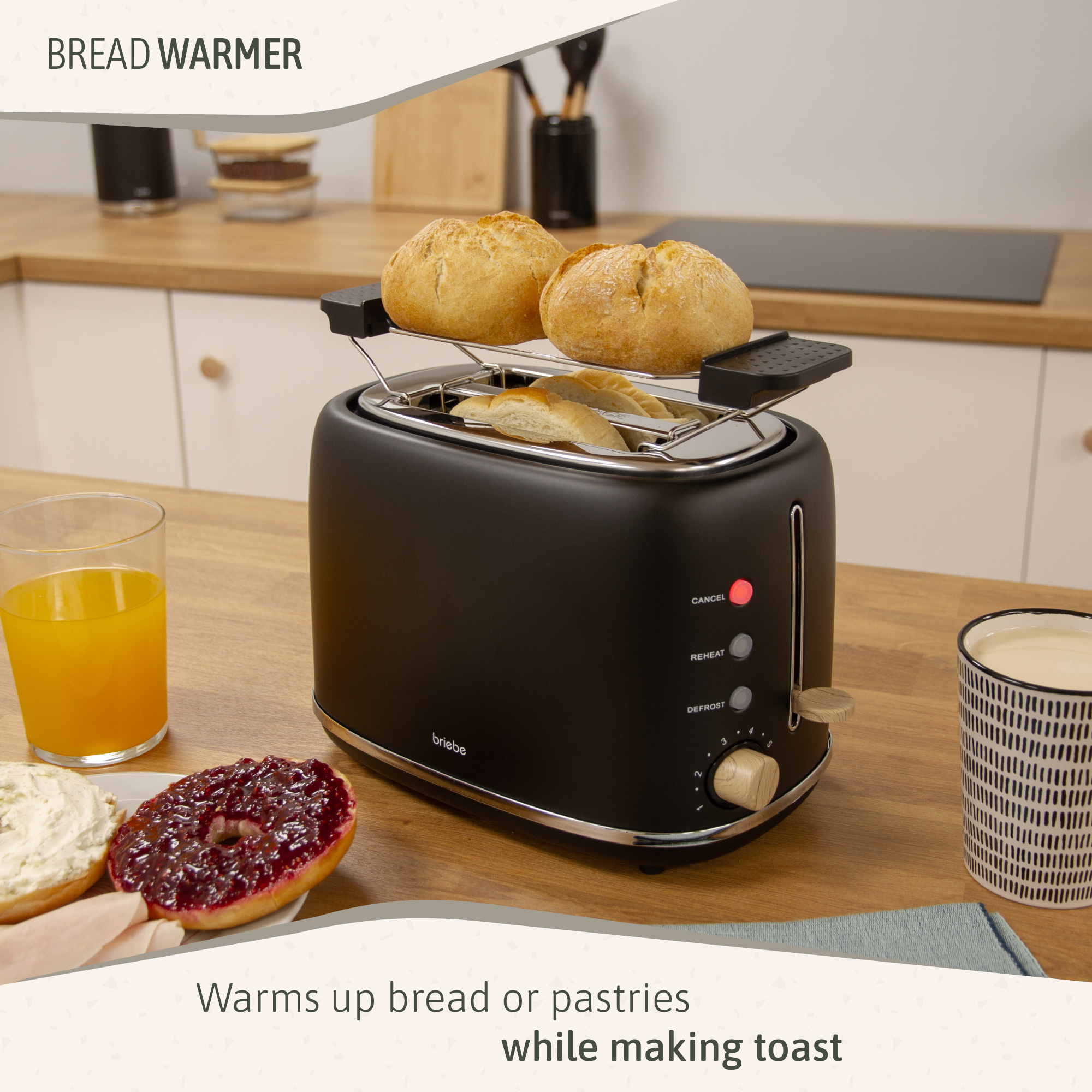 - Réchauffeur de petits pains : Il comprend une grille supérieure qui permet de réchauffer facilement les aliments volumineux tels que les pâtisseries ou les croissants, en profitant de la chaleur pendant que vous préparez vos délicieux toasts.
