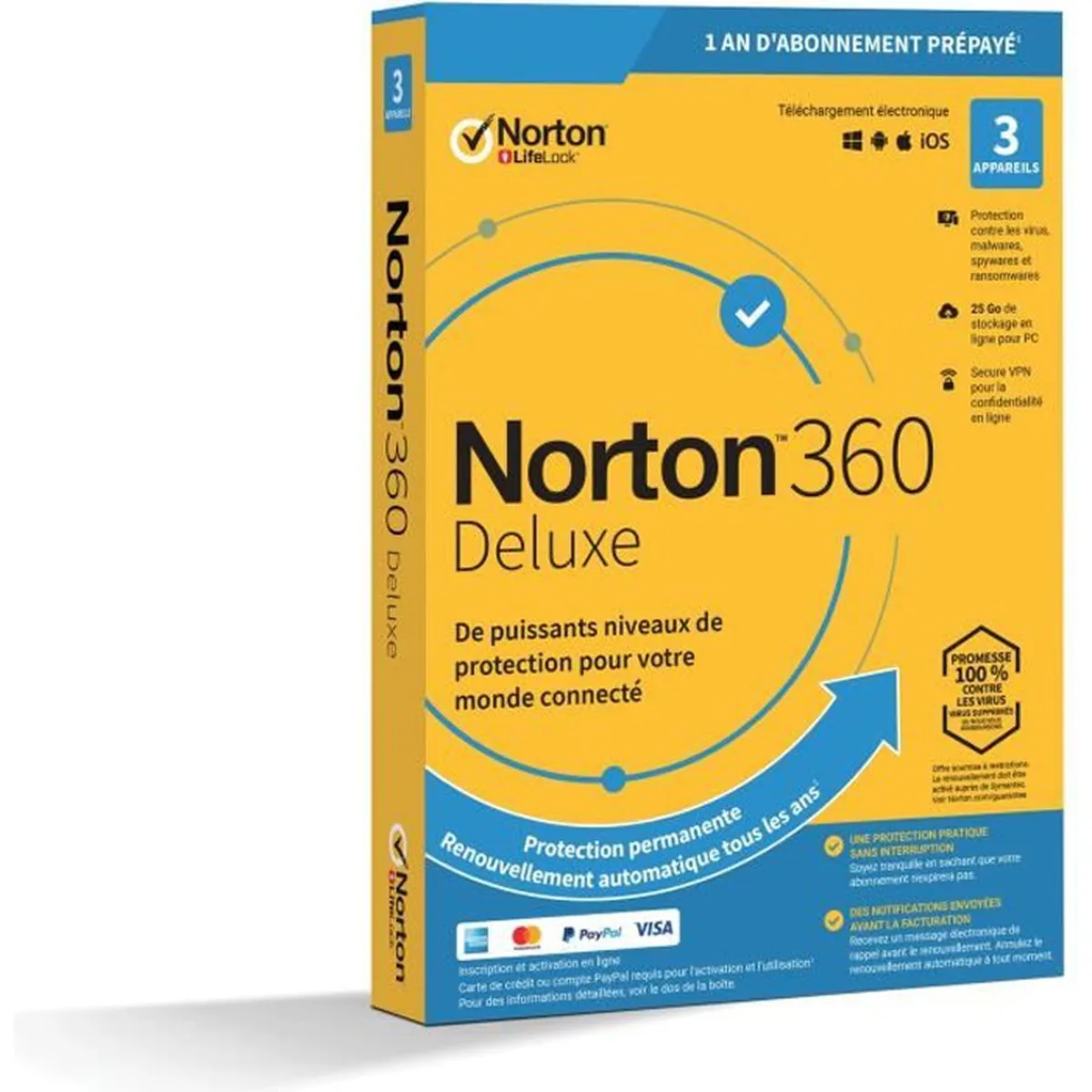 NORTON 360 Deluxe 25 Go FR 1 Utilisateur 3 Appareils - 12 Mo STD RET ENR MM - Protection contre les menaces en temps réel - 25 Go de sauvegarde Cloud pour PC - Safecam pour PC - Password manager - Contrôle parental - Secure VPN - Simplicité d'utilisation, protection avancée, technologie supérieure, garantie de remboursement à 60 jours.