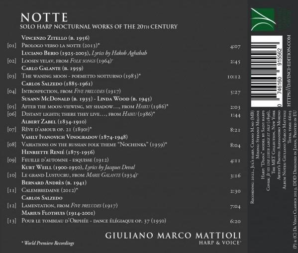Ce CD est un projet unique et captivant qui unit le potentiel expressif de la harpe à une dimension nocturne. La sélection d'oeuvres, choisies avec soin pendant dix ans, développe un récit qui se déroule entre la tombée de la nuit et la nuit profonde. Le CD propose un dialogue entre la dimension intérieure de l'auditeur et la dimension extérieure de la nature et de l'espace urbain. Avec des éléments typiques de la littérature, des arts visuels, de la psychodynamique, du symbole, du mythe, de l'archétype, du rêve, de l'inconscient, du silence et de la projection, la musique représente l'inconscient de la manière la plus efficace, tout comme le rêve.