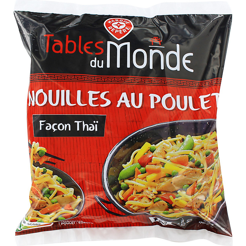 Mélange de pâtes alimentaires cuites, de légumes (50,3 %), de morceaux de viande de cuisse de poulet traité en salaison et d'une sauce soja, surgelé TABLES DU MONDE