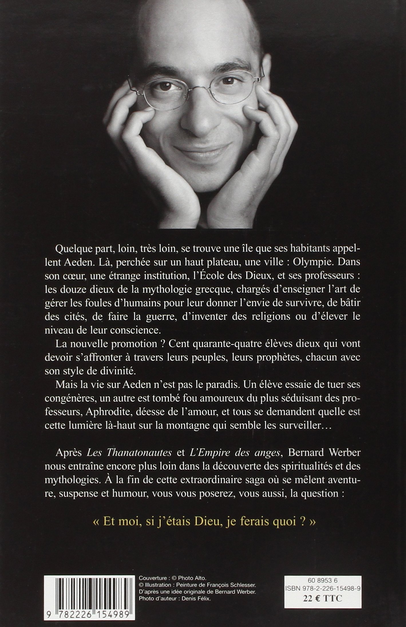 Quelque part, loin, très loin, se trouve une île que ses habitants appellent Aeden. Là, perchée sur un haut plateau, une ville : Olympie. Dans son coeur, une étrange institution, l'École des Dieux, et ses professeurs : les douze dieux de la mythologie grecque, chargés d'enseigner l'art de gérer les foules d'humains pour leur donner l'envie de survivre, de bâtir des cités, de faire la guerre, d'inventer des religions ou d'élever le niveau de leur conscience.