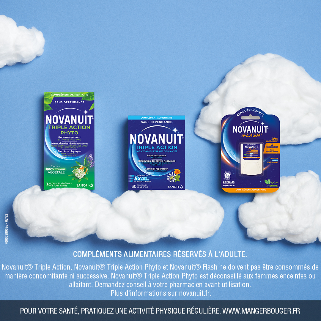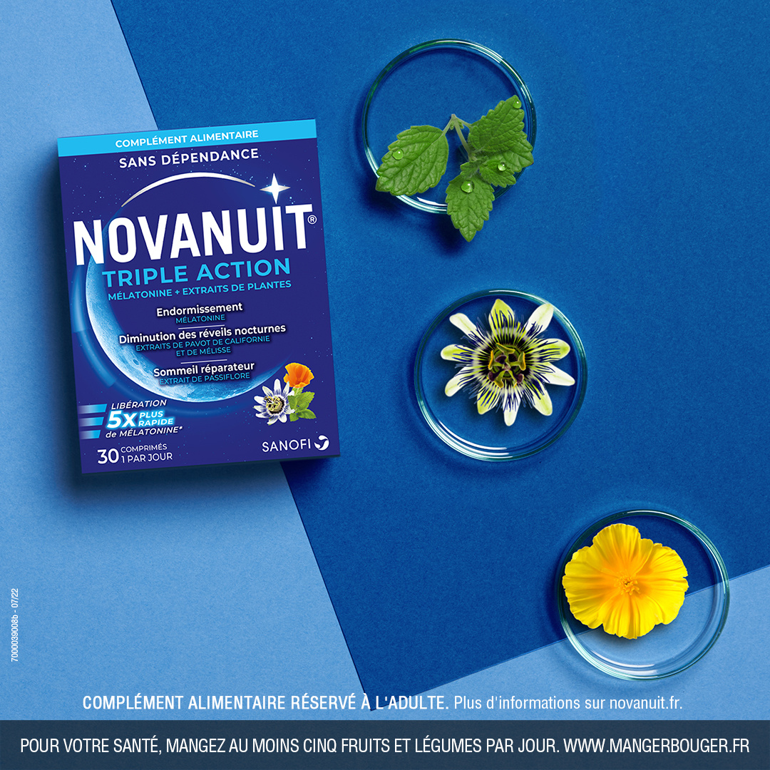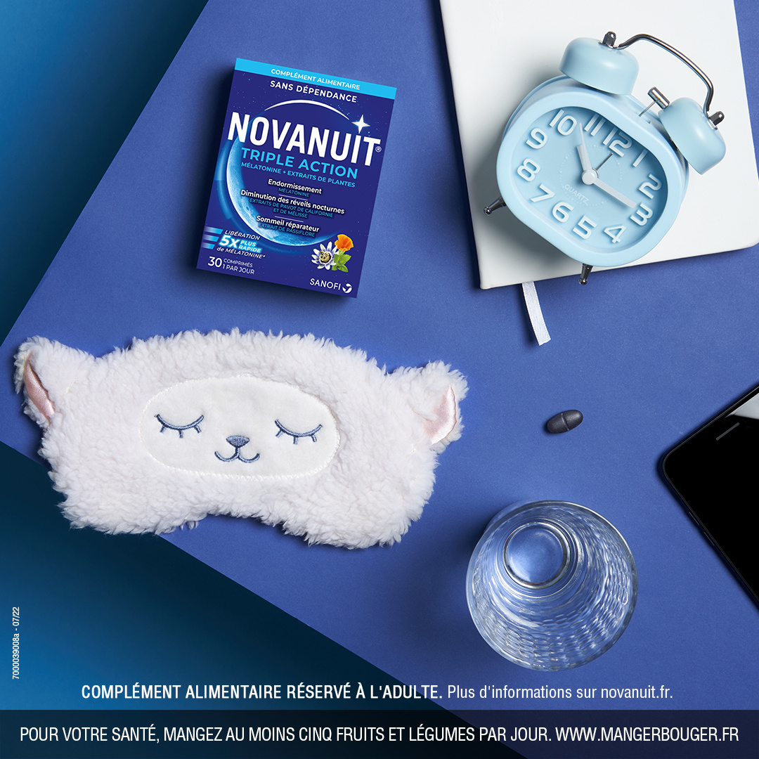 Novanuit Triple Action de Sanofi s'adresse aux adultes qui ont des difficultés pour s'endormir et/ou des troubles du sommeil. Du fait du stress, du décalage horaire, de déséquilibres d'ordre physique ou psychique, le sommeil peut être perturbé. Le sommeil est trop court ou de mauvaise qualité et les personnes se réveillent fatiguées. Pour retrouver un sommeil réparateur, il peut être nécessaire de prendre un complément alimentaire comme Novanuit Triple Action. Les comprimés Novanuit contiennent de la passiflore. Cette plante est utilisée pour ses propriétés apaisantes qui réduisent la nervosité et améliorent la qualité du sommeil. L'action de la passiflore est complétée par celle du pavot de Californie et de la mélatonine qui facilitent l'endormissement. Novanuit Triple Action comprend également de la mélisse, une plante calmante qui aide à réduire les troubles du sommeil.